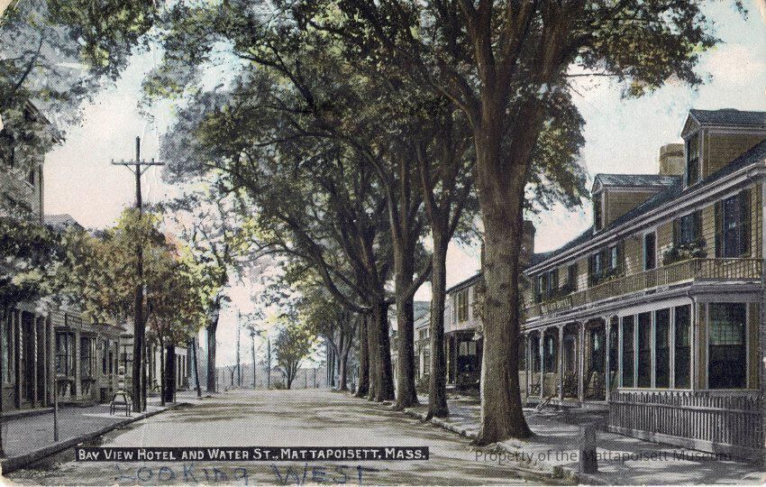 Hand-colored postcard showing Bay View Hotel and Water St., Mattapoisett, Mass. Handwritten on the bottom is "Looking West".Collection