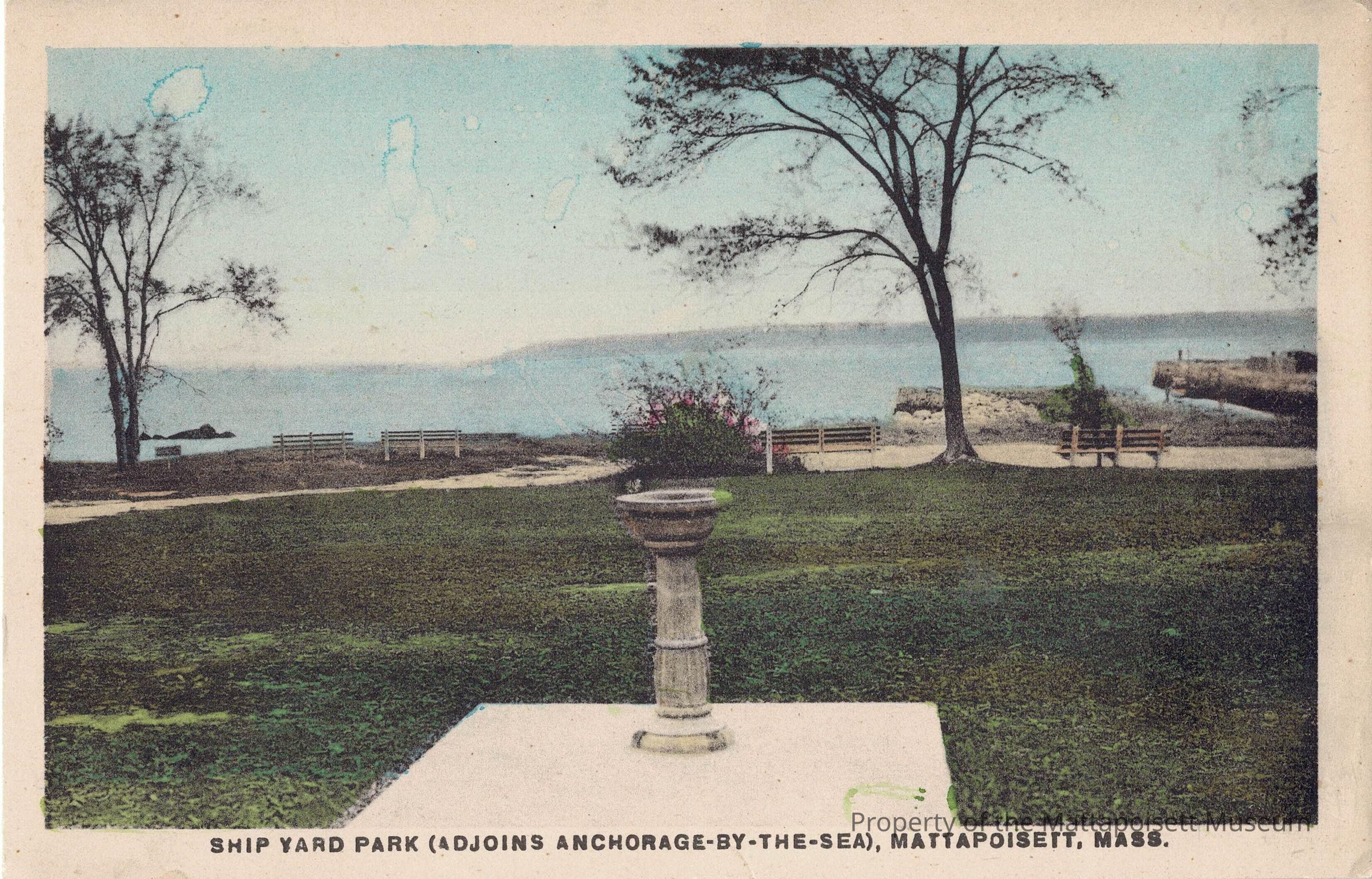 Hand-colored postcard showing Ship Yard Park (adjoins Anchorage-By-The-Sea), Mattapoisett, Mass. Pre-address of Alice C. Ordway, North Street, Mattapoisett, Massachusetts.Collection