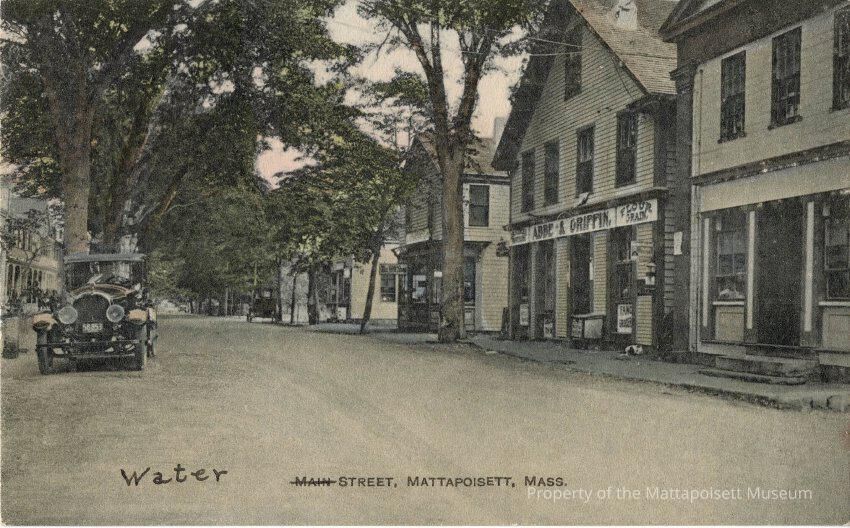 Hand-colored postcard Water (Main crossed out and Water handwritten) Street, Mattapoisett, Mass. Pre-address of Alice C. Ordway, North Street, Mattapoisett, Massachusetts.Collection