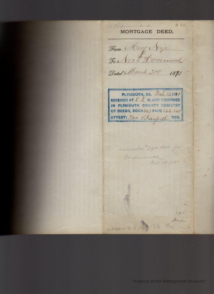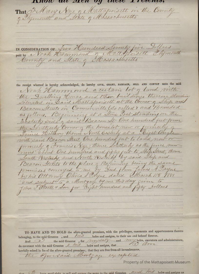 Mary & George Nye, by his attorney, May Nye to Noah Hammond, land, dwelling house and buildings on Ship and Beacon Streets in Cannonville for $575.Collection
