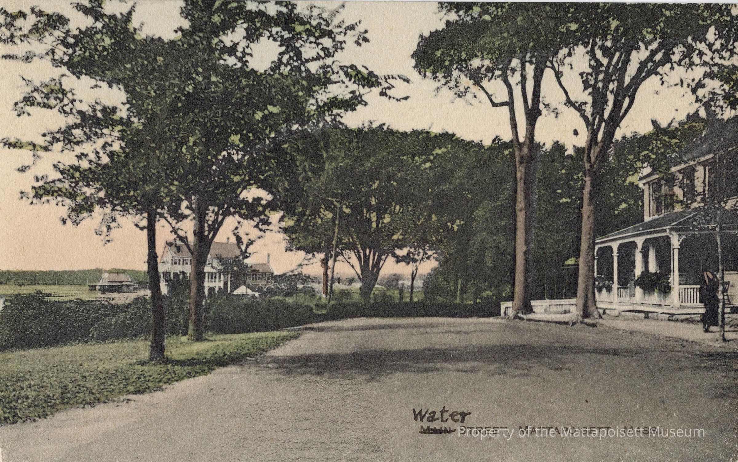 Hand-colored postcard showing Water (Main crossed off and Water handwritten in ink) Street, Mattapoisett, Mass. Pre-address of Alice C. Ordway, North Street, Mattapoisett, Massachusetts.Collection