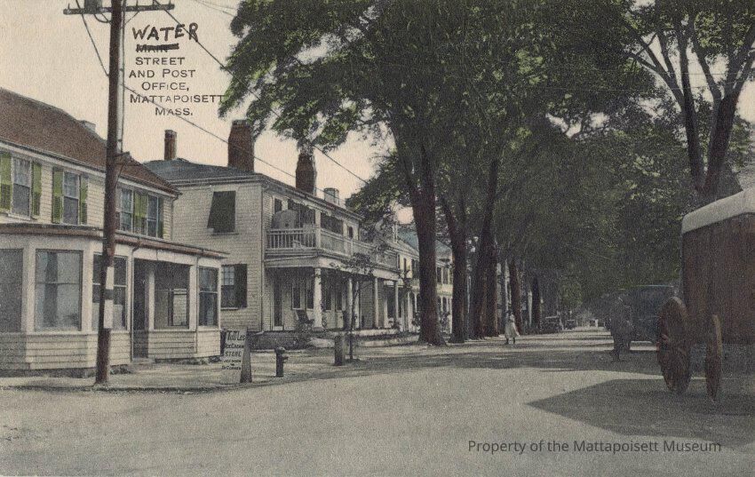 Black and white postcard showing Water (Main crossed out and Water handwritten in ink) Street And Post Office, Mattapoisett, Mass. Pre-address of Alice c Ordway, North Street, Mattapisett, Mass.Collection