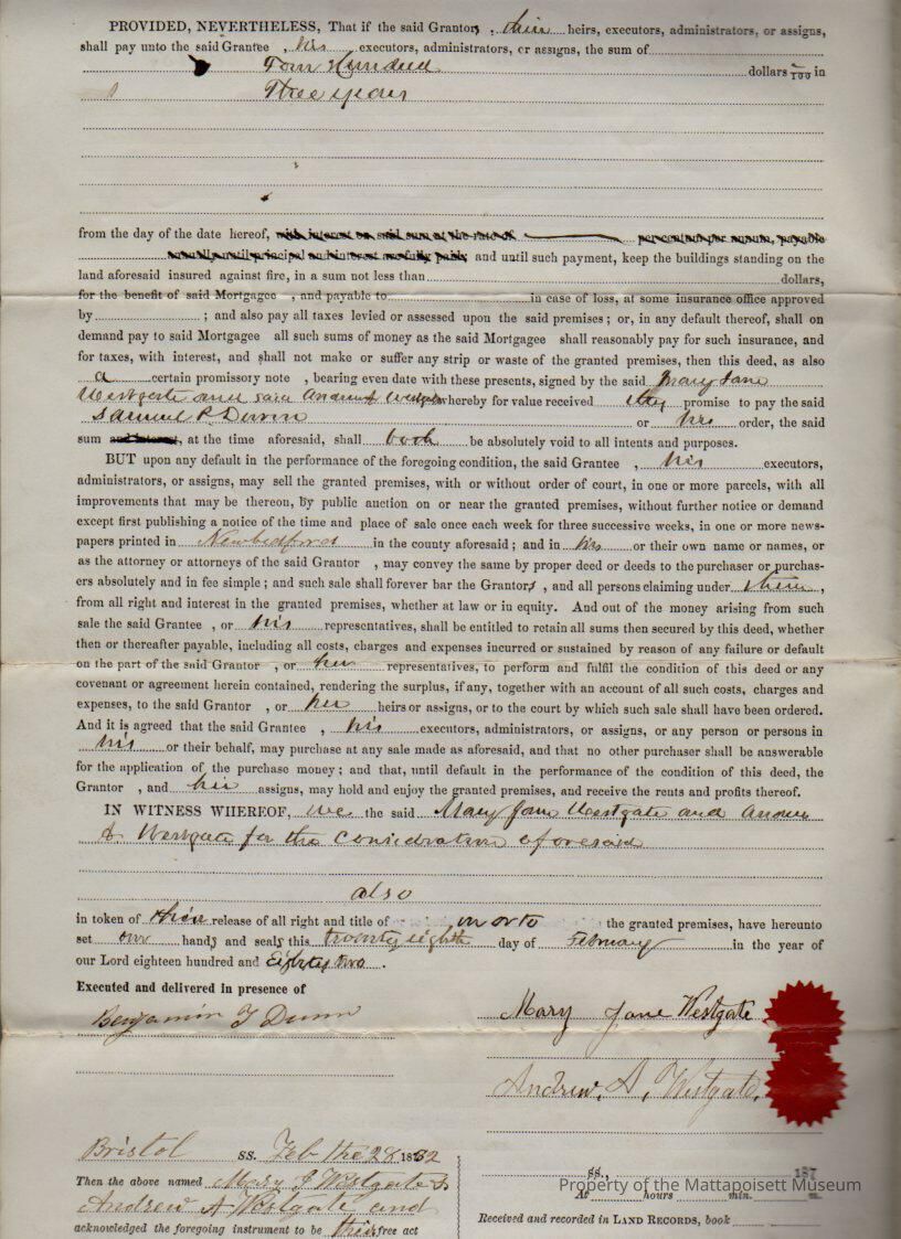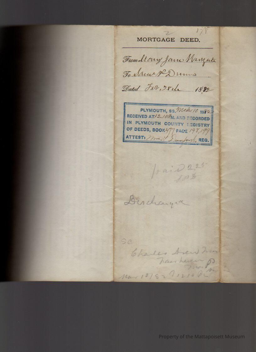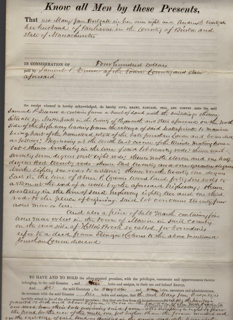 Mary Jane & Andrew A. Westgate to Samuel P. Dunn, farm or wood, buildings on the road from Mattapoisett to Marion, plus one lot of salt marsh, total 24 acres.Collection