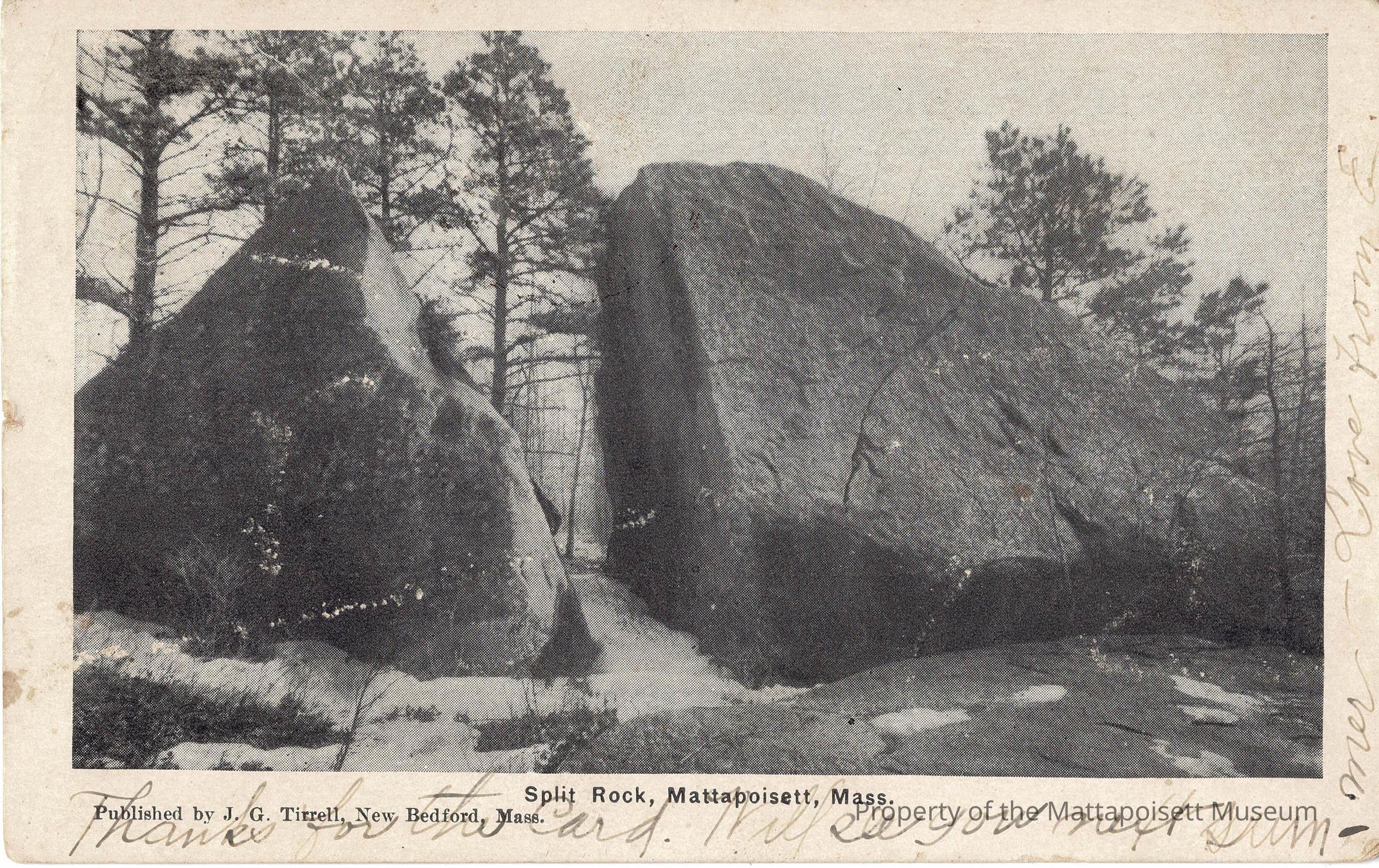 A postcard showing the Split Rock in Mattapoisett. Sent to Mary Hoyt in New Hampshite, postmarked 1906.Collection
