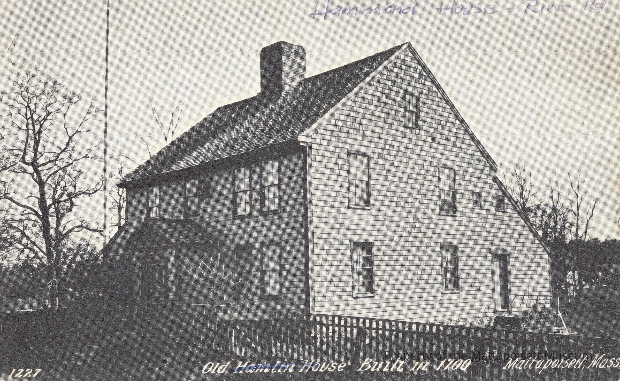 Black and white postcard showing the Hammond House on River Road, built around 1700 Mattapoisett, Mass. This house was torn down in 1910.
