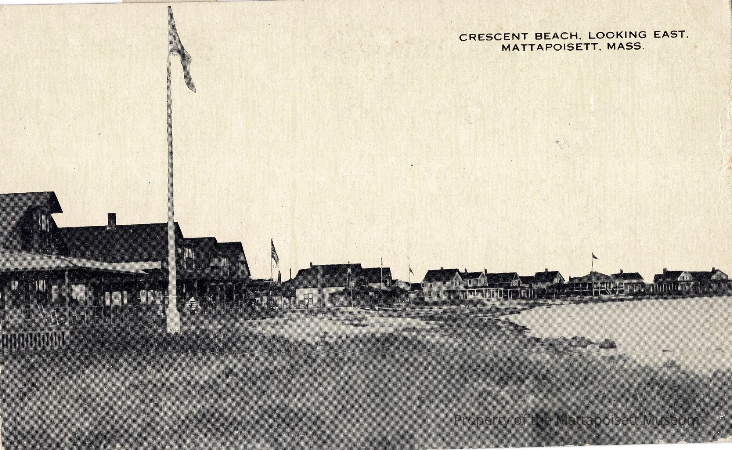 Black and white postcard showing Crescent Beach, Looking East, Mattapoisett, Mass. Reverse writing in blue ink "writtten by Ruth R. Taylor in FHS". Stenography writing in black ink on left side of postcard.Collection