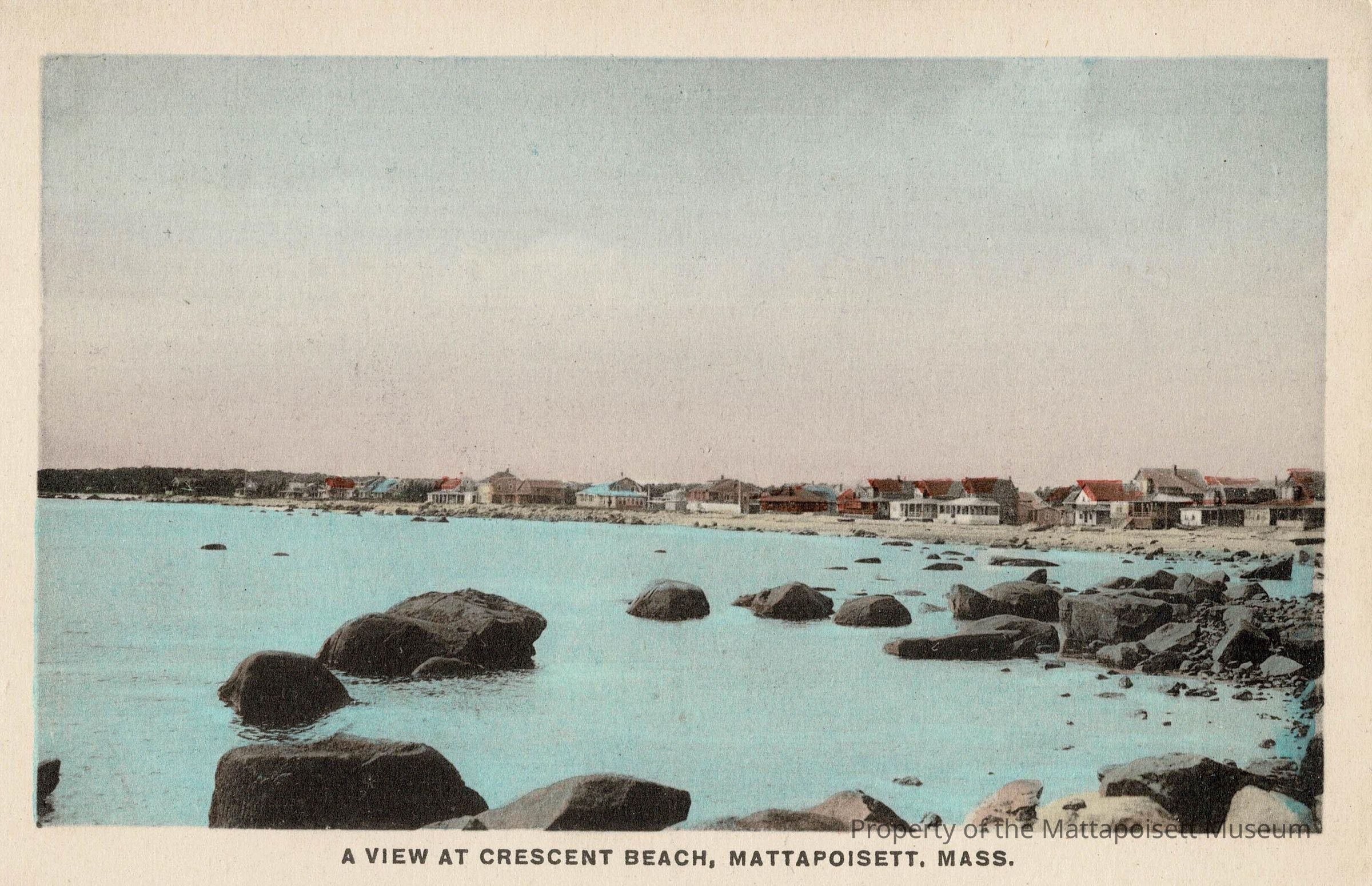 Hand-colored postcard showing A View at Crescent Beach, Mattapoisett, Mass. Reverse writing in black ink begins a note to "Myron" from "DJT".Collection