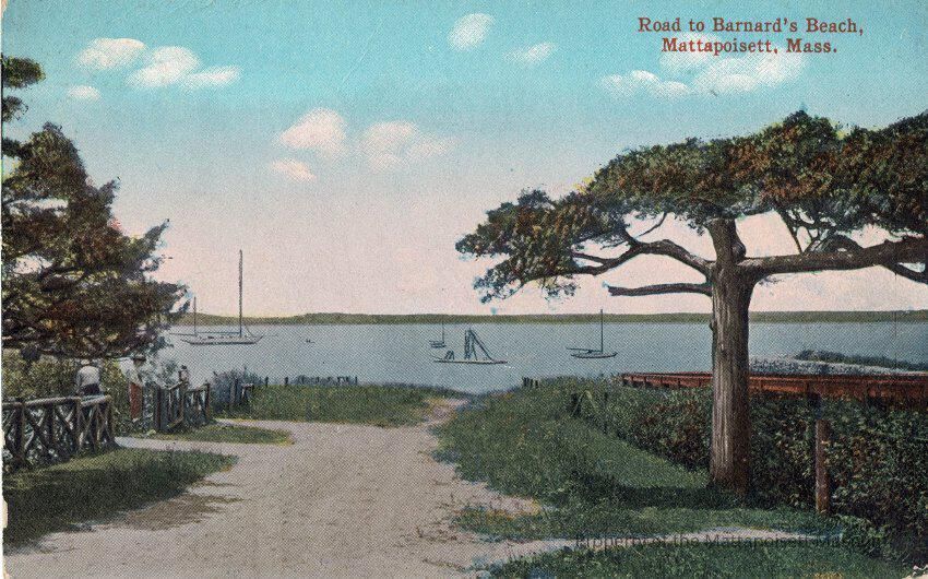 Hand-colored postcard showing Road to Barnard's Beach, Mattapoisett, Mass. Reverse hand-written letter addressed to Mrs. Baxter, 264 Massachusetts Ave., Providence R.I. Postmarked Aug 7, 1917, 4PM, Mattapoisett, Mass.Collection