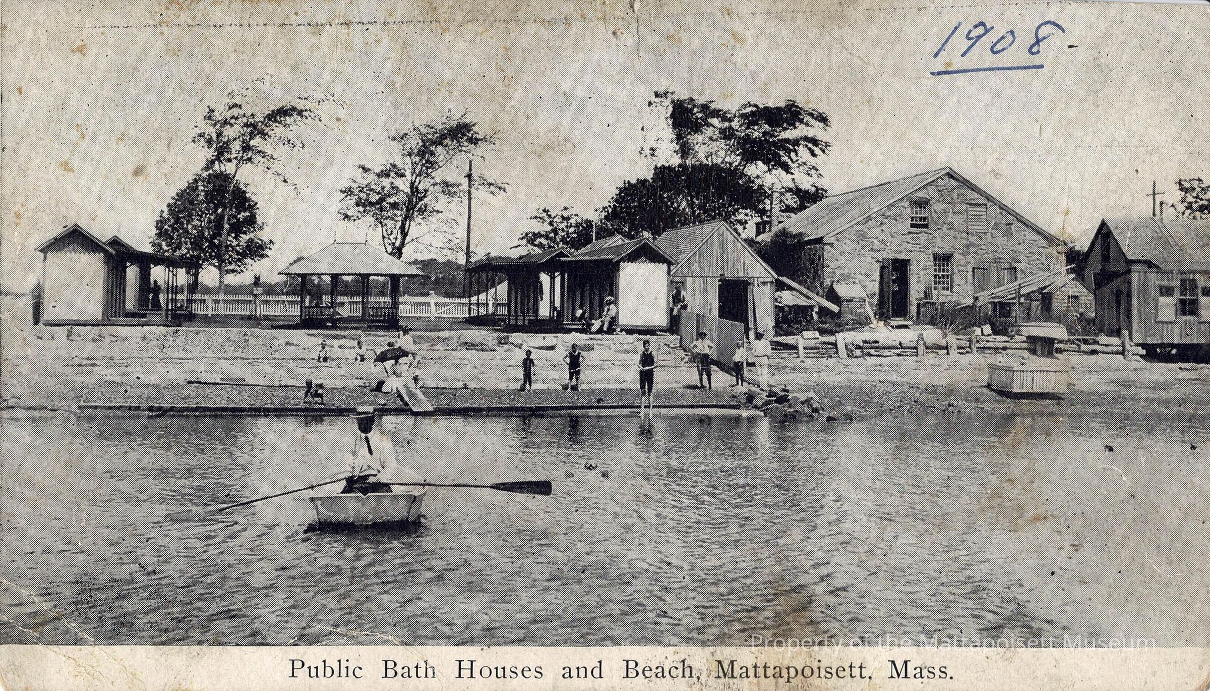 Black and white postcard showing Public Bath Houses and Beach, Mattapoisett, Mass. Hand-written in blue ink "1908".Collection