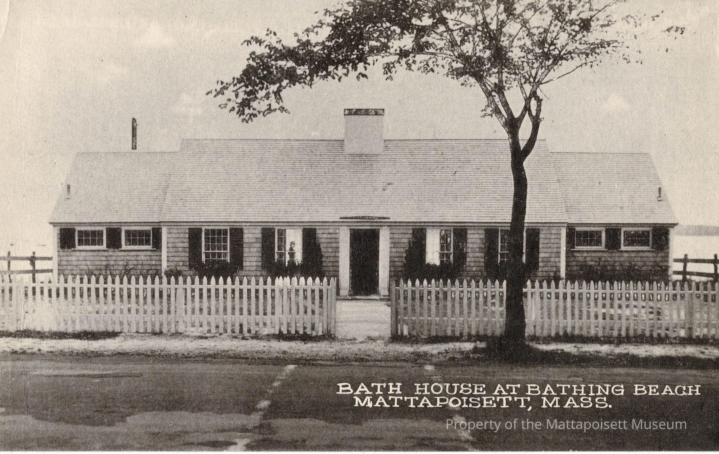 Black and white postcard showing Bath House at Bathing Beach, Mattapoisett, Mass.Collection