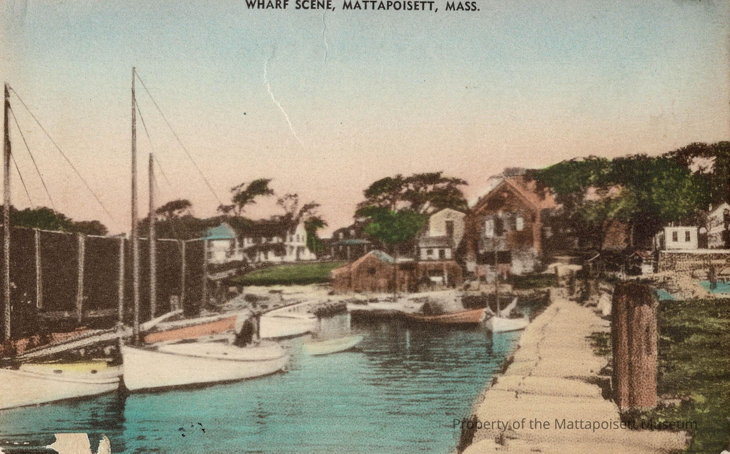 Hand-colored postcard showing Wharf Scene, Mattapoisett, Mass. Hand-written note to Mrs. Mary Malcolm, 7315 Lexington Ave, Cleveland, Ohio. No postmark or dates.Collection