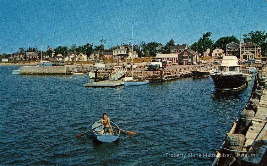 Colored picture postcard showing Waterfront, Matttapoisett, Mass as Viewed from Long Wharf.