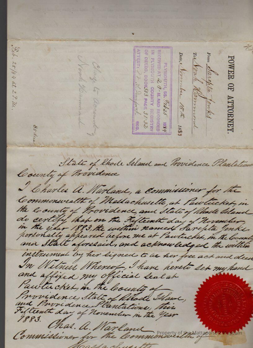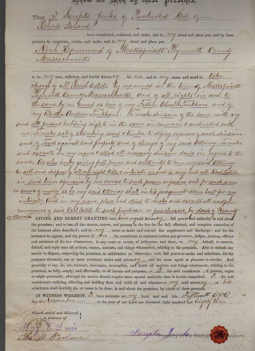 Sarepta Jenks of Rhode Island, Power of Attorney to Noah Hammond, convey or divide real estate.Collection