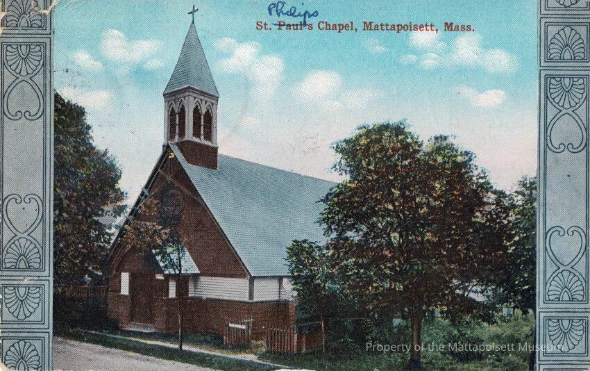 Hand-colored postcard showing St. Paul's Chapel, Mattapoisett, Mass. "Paul's" is lined out in blue ink and "Philips" handwritten above.Collection