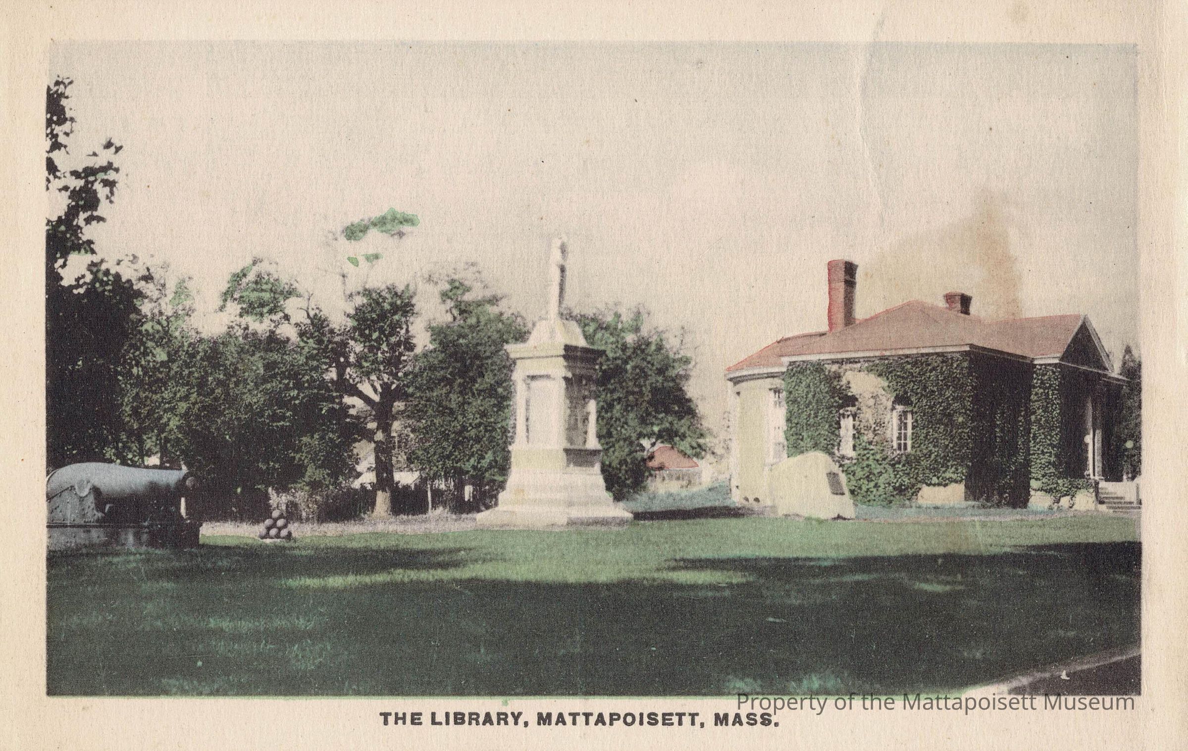 Hand-colored postcard showing The Library, Mattapoisett, Mass. Pre-address of Alice C. Ordway, North Street Mattapoisett, Massachusetts.Collection
