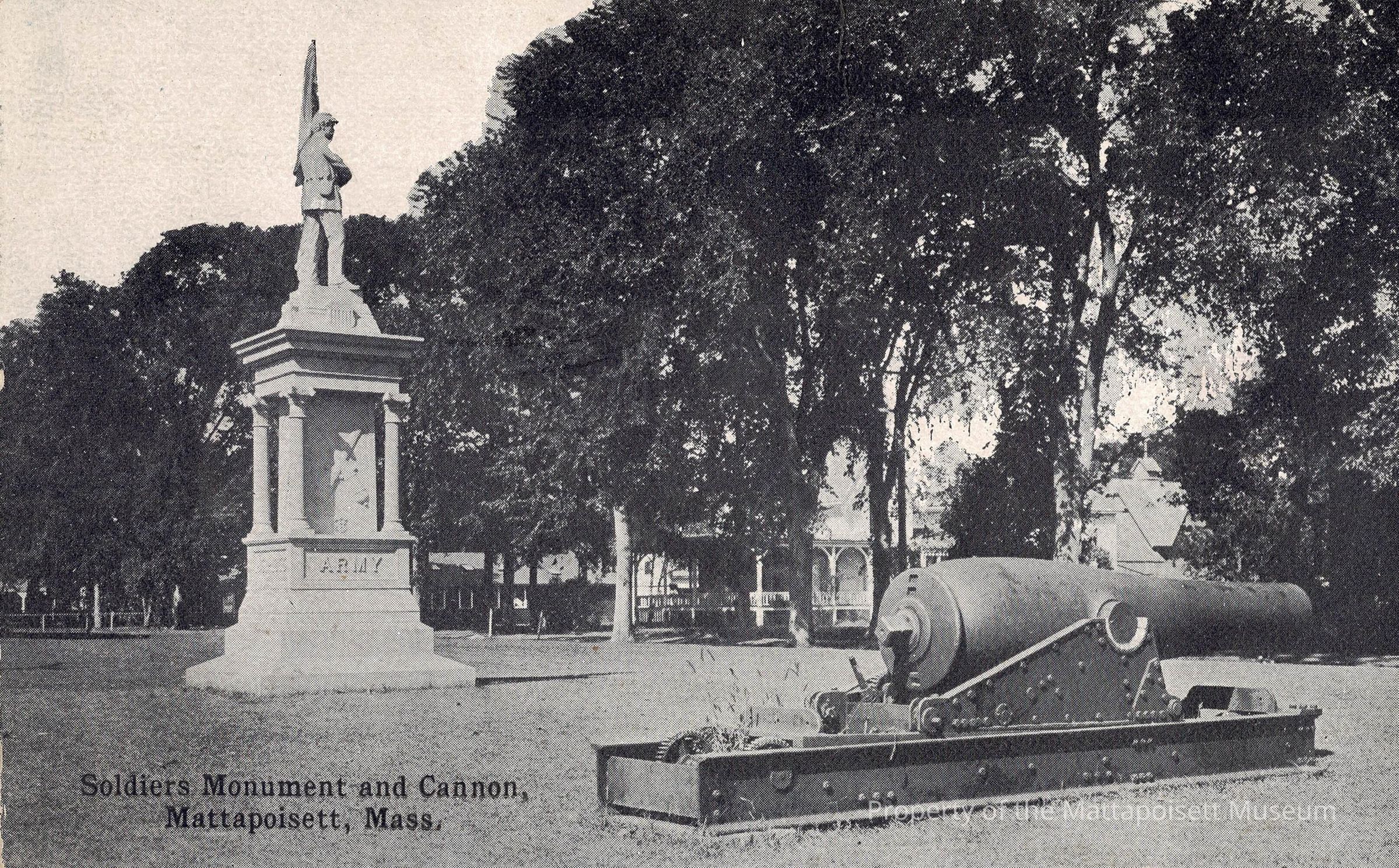 Black and white postcard showing Soldiers Monument and Cannon, Mattapoisett, Mass. Pre-address of Alice C. Ordway, North Street, Mattapoisett, Massachusetts.Collection