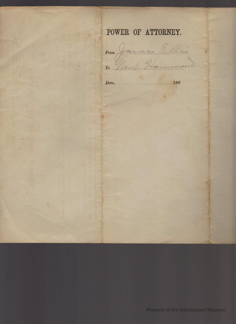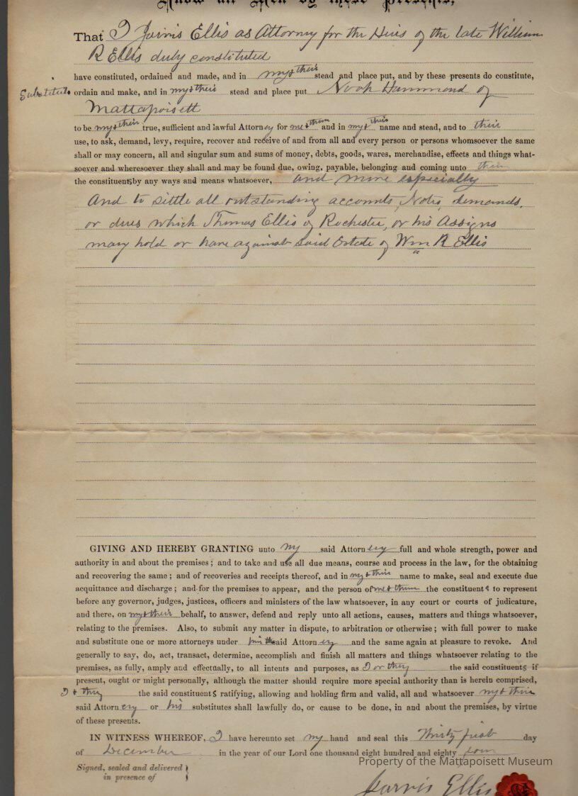 Jarvis Ellis, as attorney for the heirs of William R. Ellis estate, Power of Attorney to Noah Hammond, to settle accounts, notes, demands or dues to Thomas Ellis, against estate.Collection