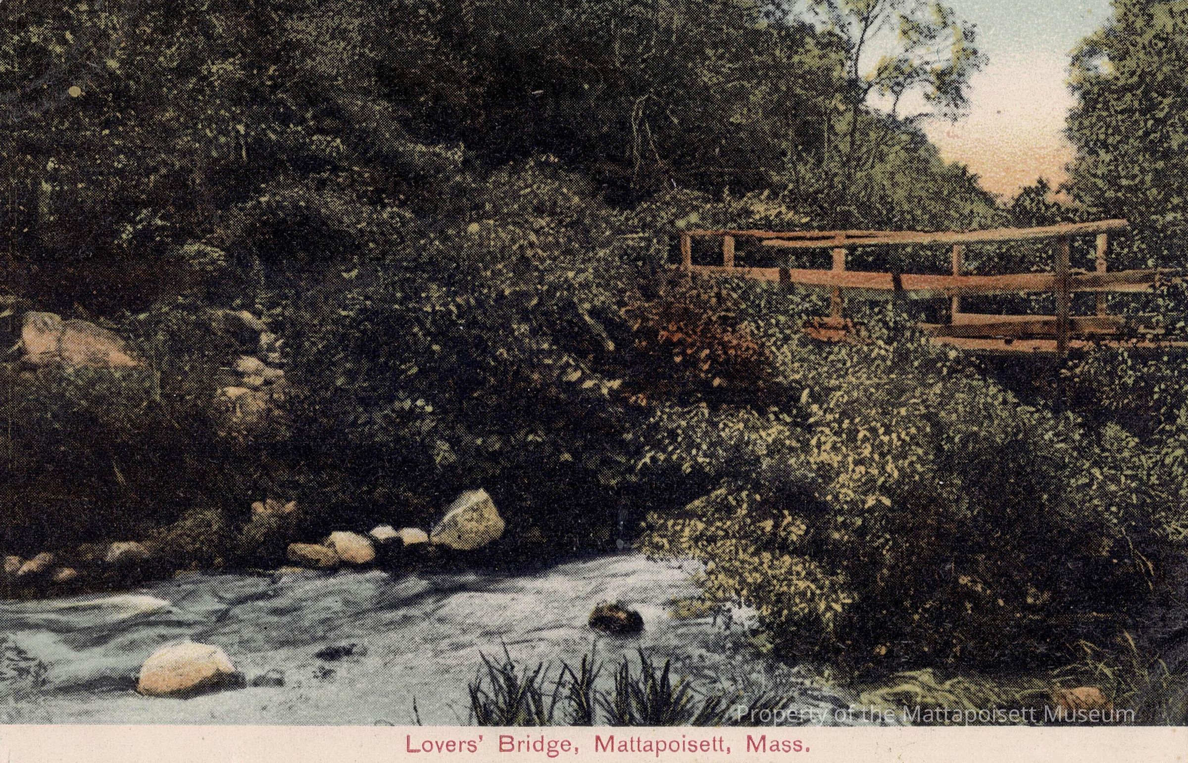 Hand-colored postcard showing Lovers' Bridge, Mattapoisett, Mass. Hand-written note from Susan to Miss Dwight, Nahaut, Mass. Postmarked June 24, 1908, Mattapoisett, Mass.Collection