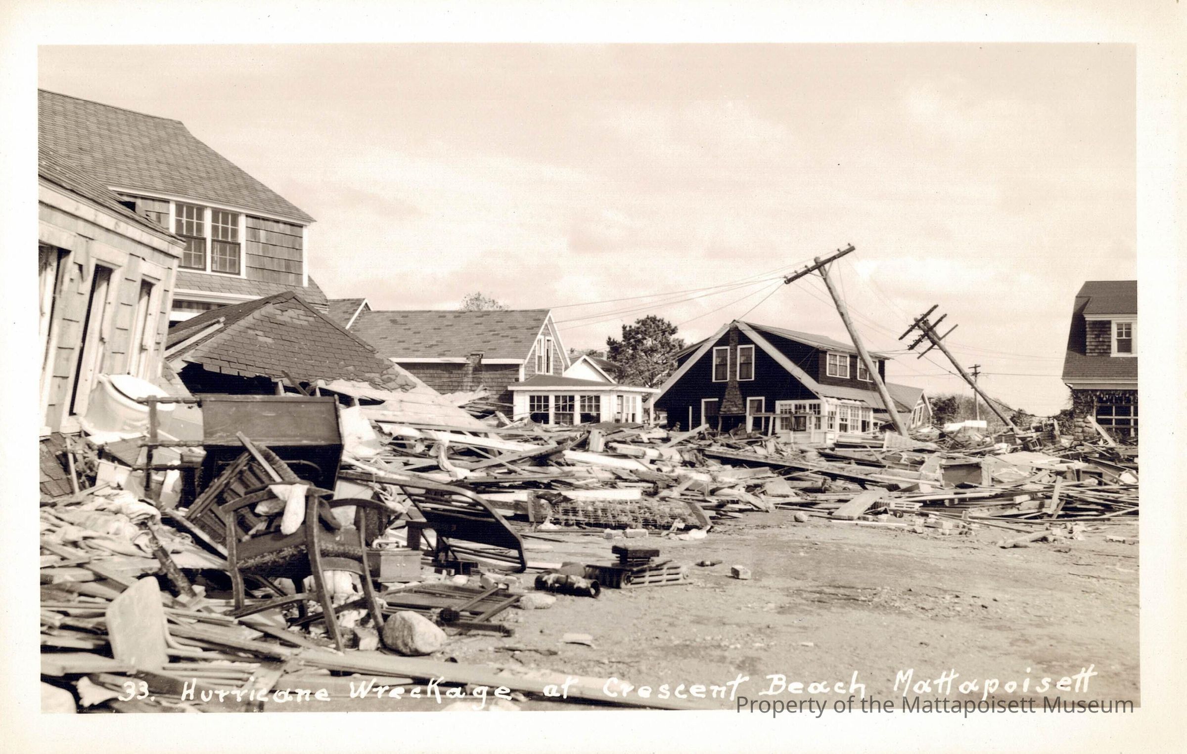 Black and white postcard showing Hurrican Wreckage at Crescent Beach Mattapoisett.Collection