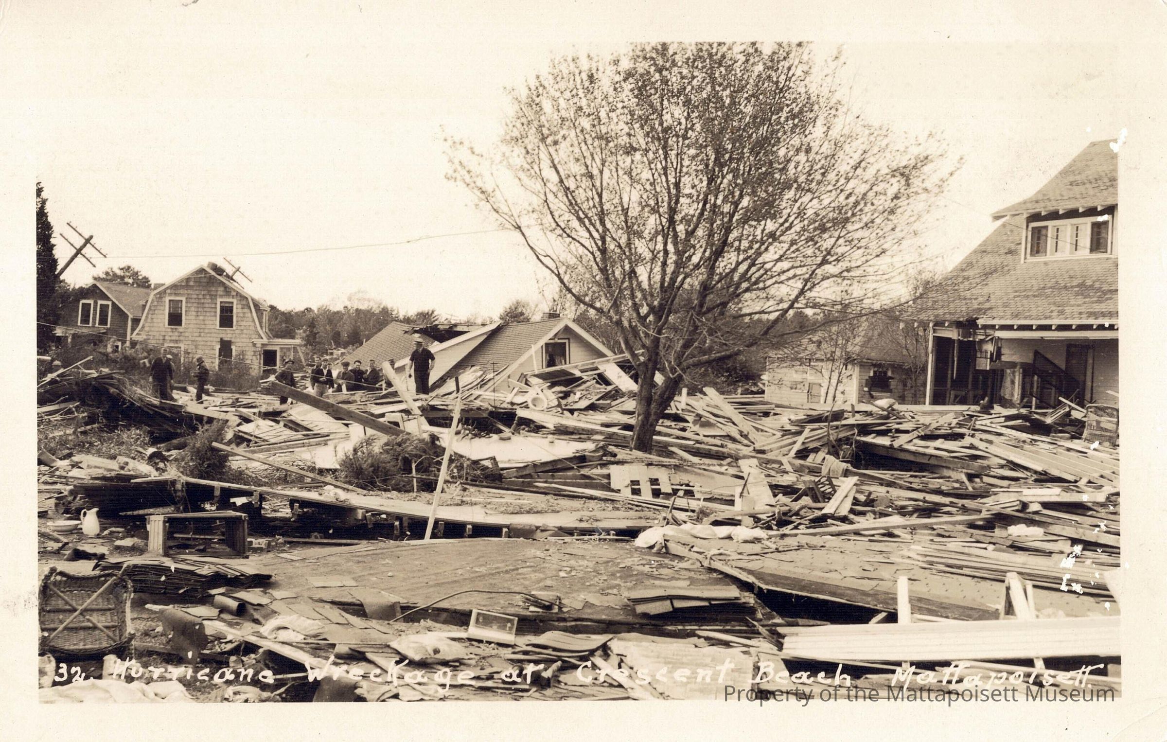 Black and white postcard showing Hurricane Wreckage at Crescent Beach Mattapoisett.Collection