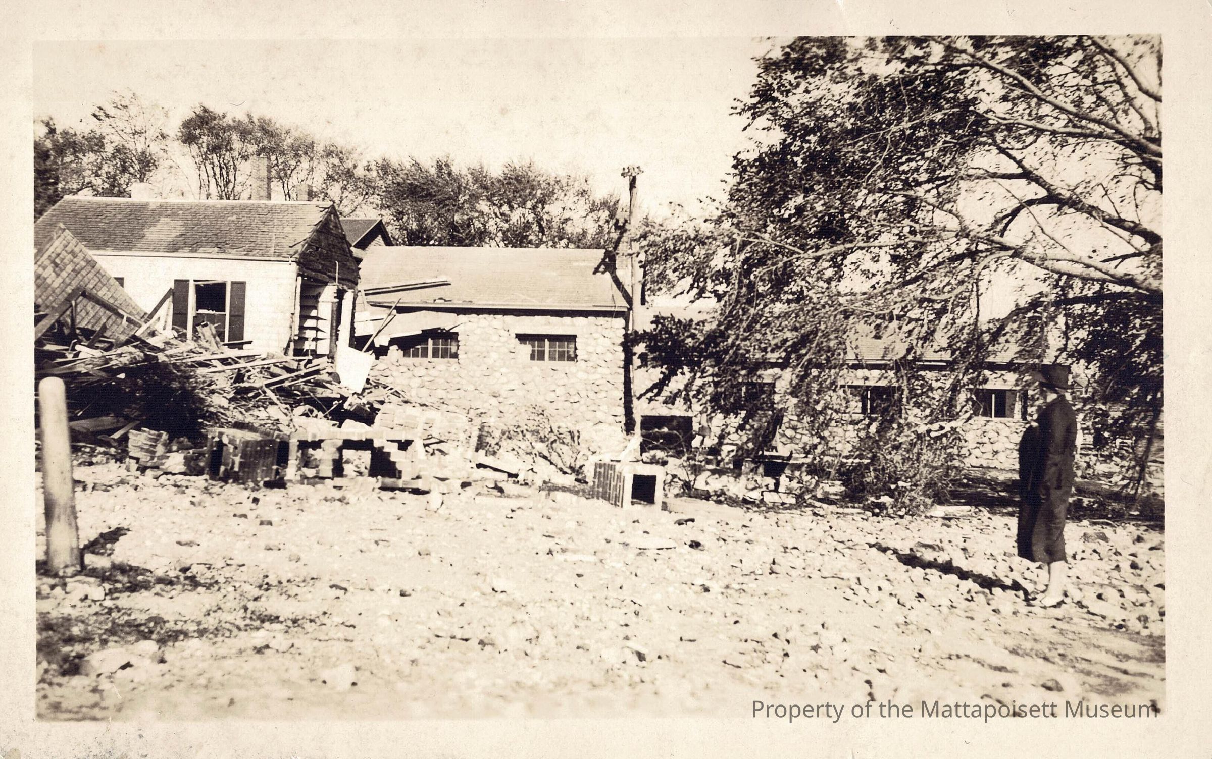 Black and white postcard showing view of hurricane wreckage. Handwritten on back states "This is the Anchorage or where it was with the former coalhouse left - and Lewis Bolles garage. Woman is Mrs. Barrows."Collection