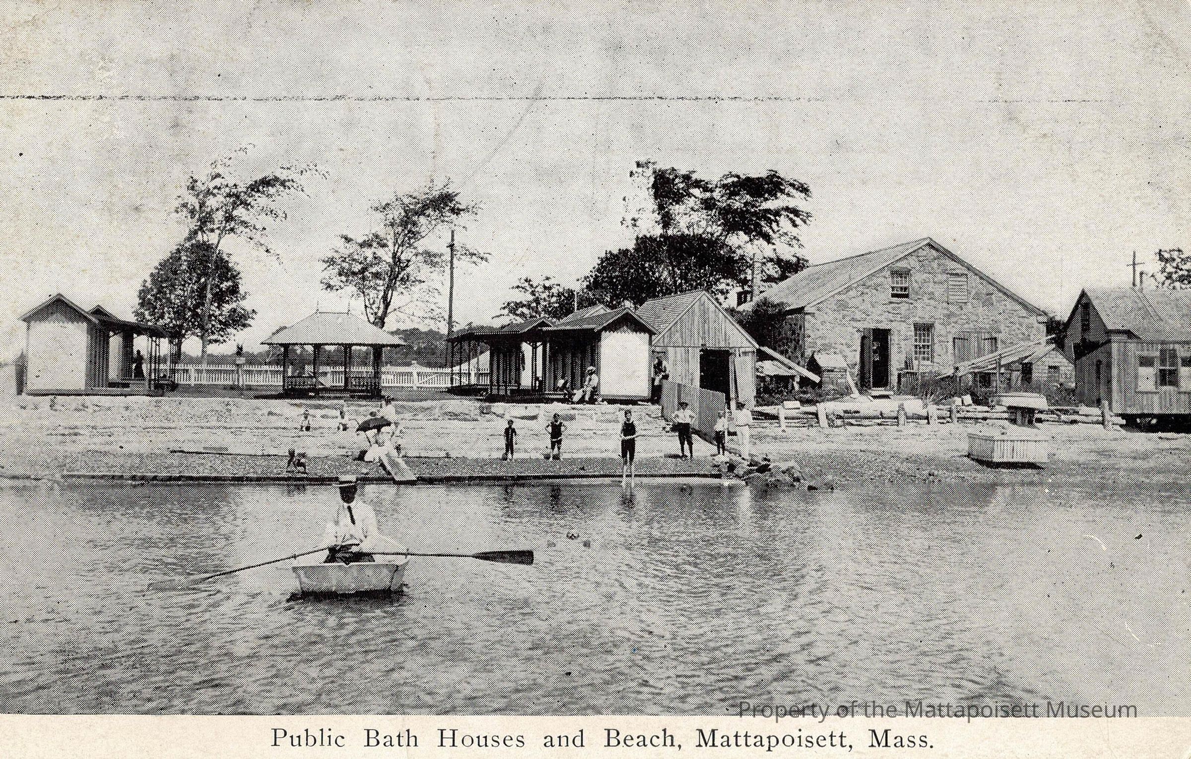 Black and white postcard showing Public Bath House and Beach, Mattapoisett, Mass. Handwritten note to Miss Lizzie Bellam, So Main St., Natick, Mass. Postmarked from Mattapoisett, Mass on August 28, 1909.Collection