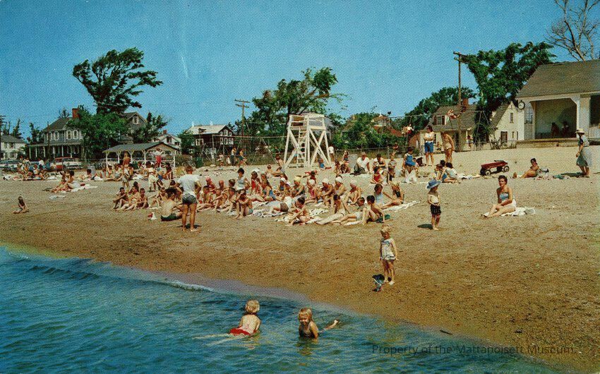 Color postcard showing the bathing beach in Mattapoisett, Mass. Handwritten message to Miss Priscilla Tinkham, North Street, Mattapoisett, Massachusetts. Postmarked from Boston, Mass on August 28, 1964.Collection