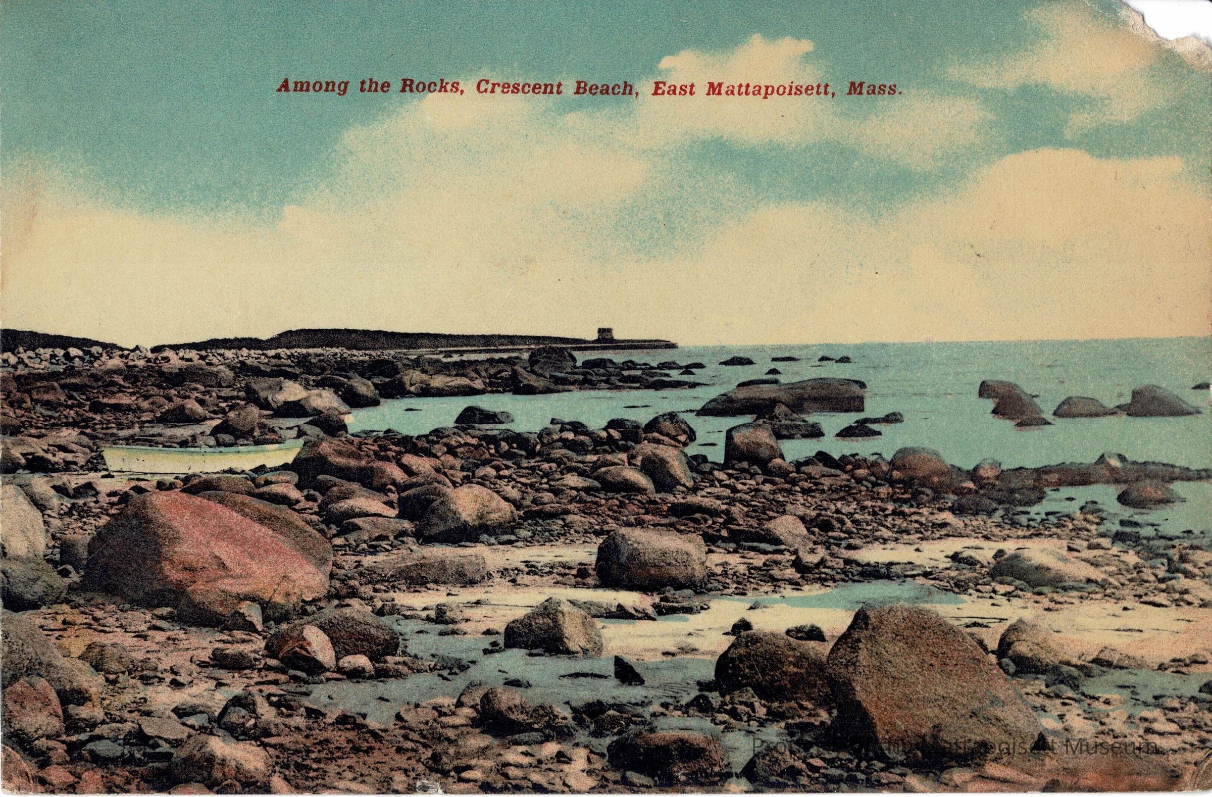 Hand-colored postcard showing Among the Rocks, Crescent Beach, East Mattapoisett, Mass. Hand-written note to Mrs. Walter Baxter, #264 Massachusetts Ave, Providence, R.I. Postmarked from East Mattapoisett, Mass on July 8, 1911.Collection