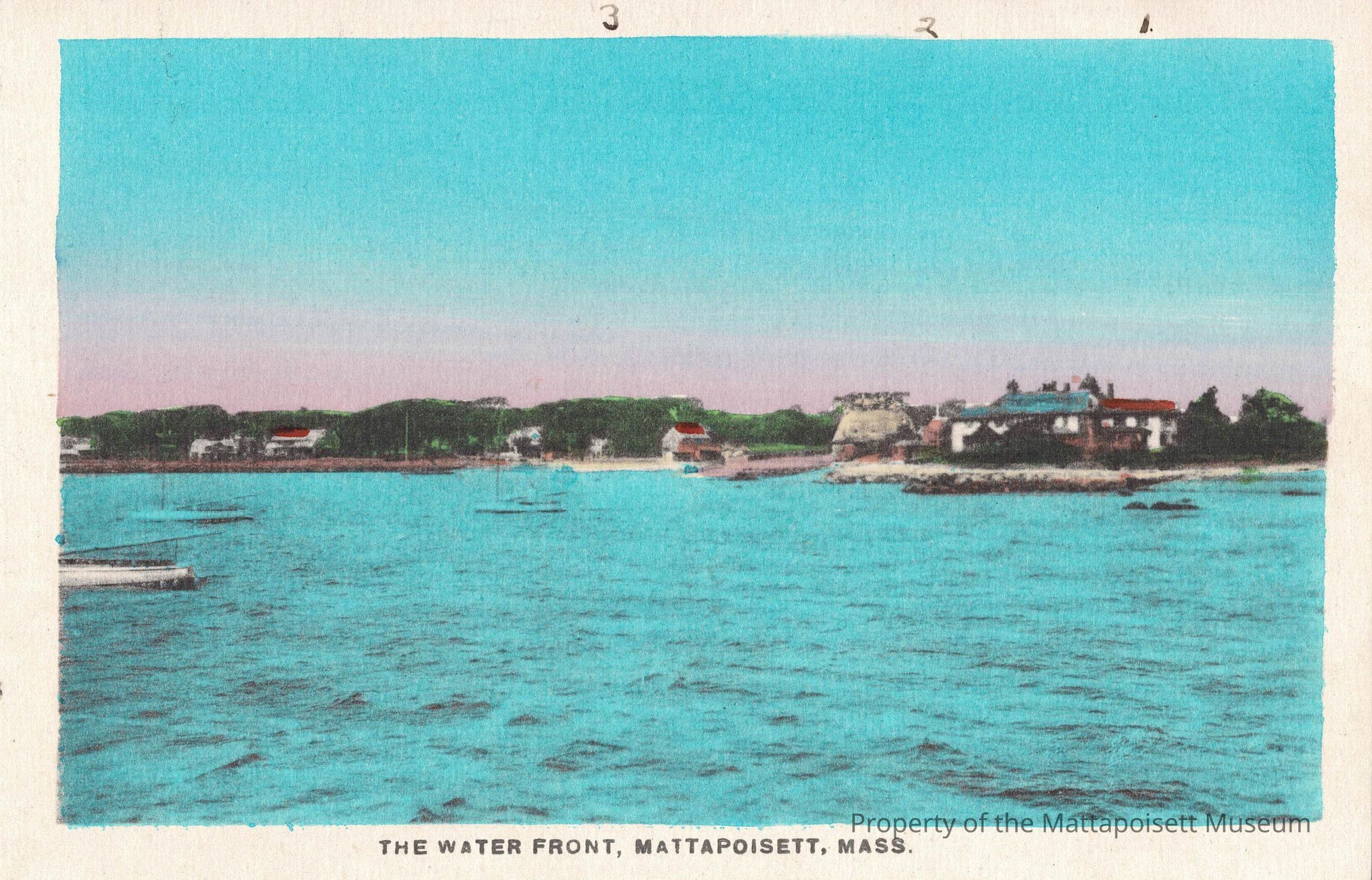 Hand-colored postcard showing The Water Front, Mattapoisett, Mass. Hand-written note on reverse showing House 1- Mrs. Parson's house; 2 - the town bathing beach; House 3 - R.S. Barstow's house showing through the trees.Collection