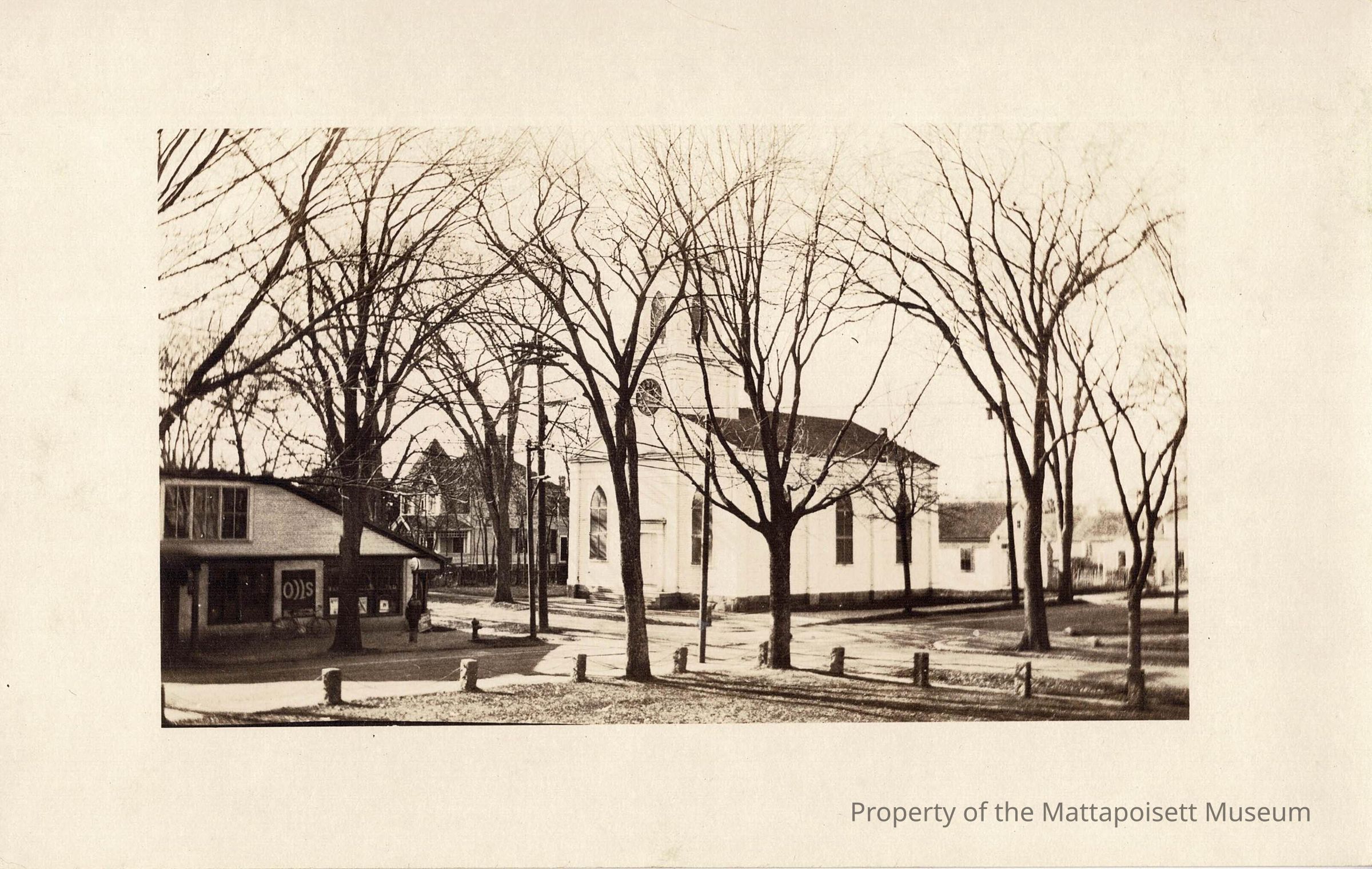 Black and white postcard showing The Universalist Church, Mattapoisett, Mass. Reverse handwritten information with date of 1925 showing Goodspeed Memorial.Collection