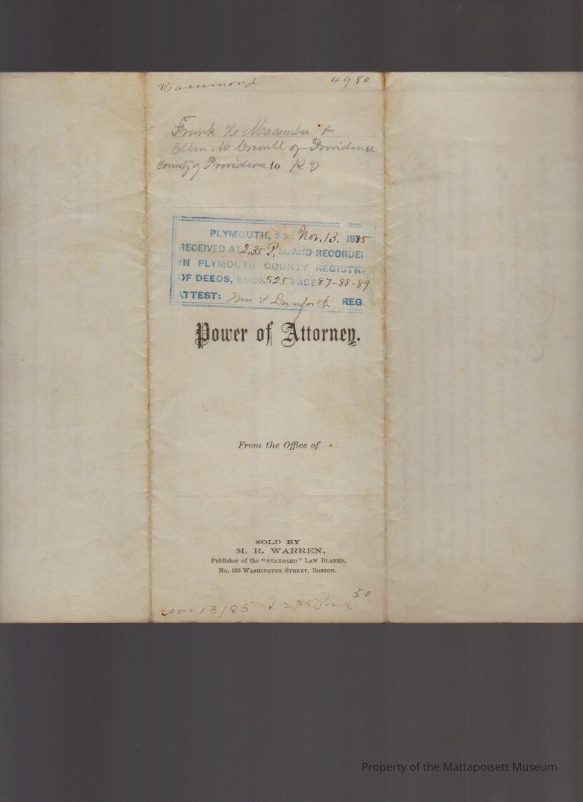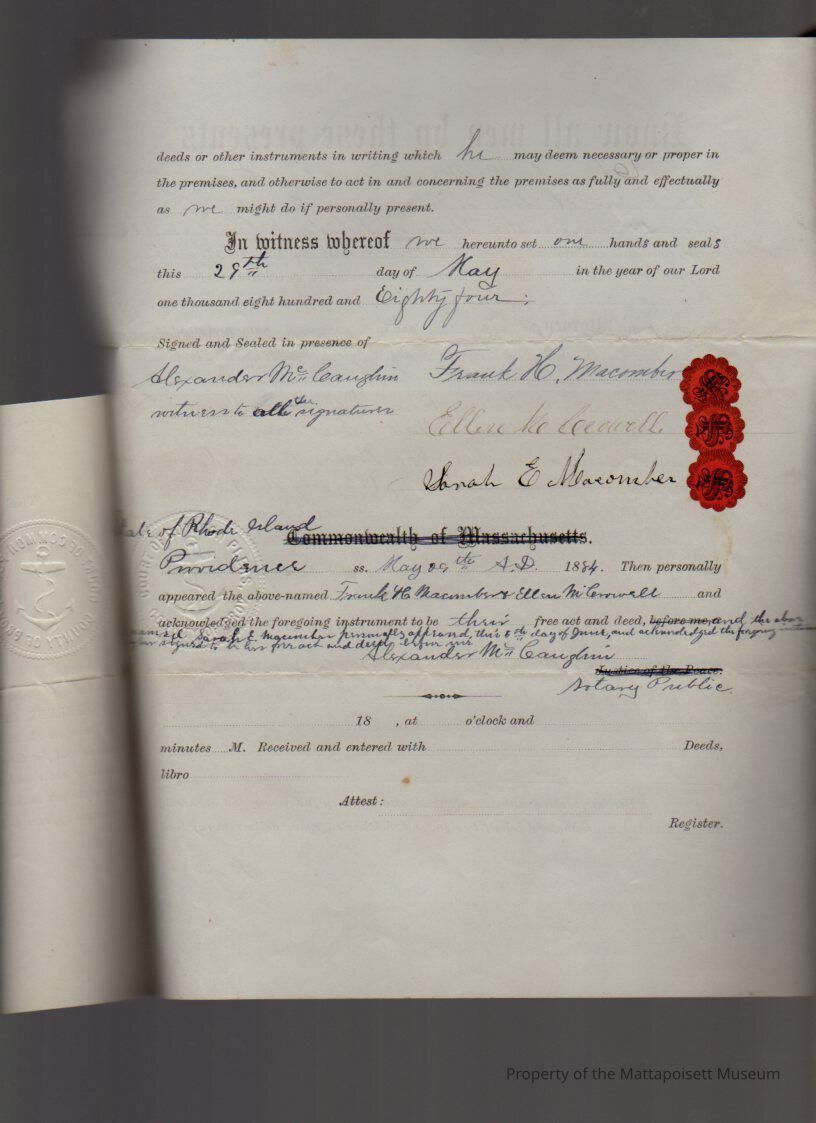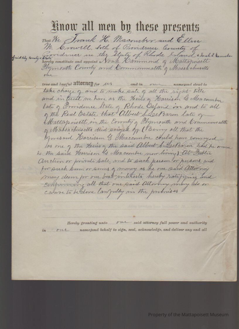 Frank H. & Ellen Macomber and Sarah E. Macomber of Rhode Island, Power of Attorney to Noah Hammond, sale of estate of Albert S. LeBaron.Collection