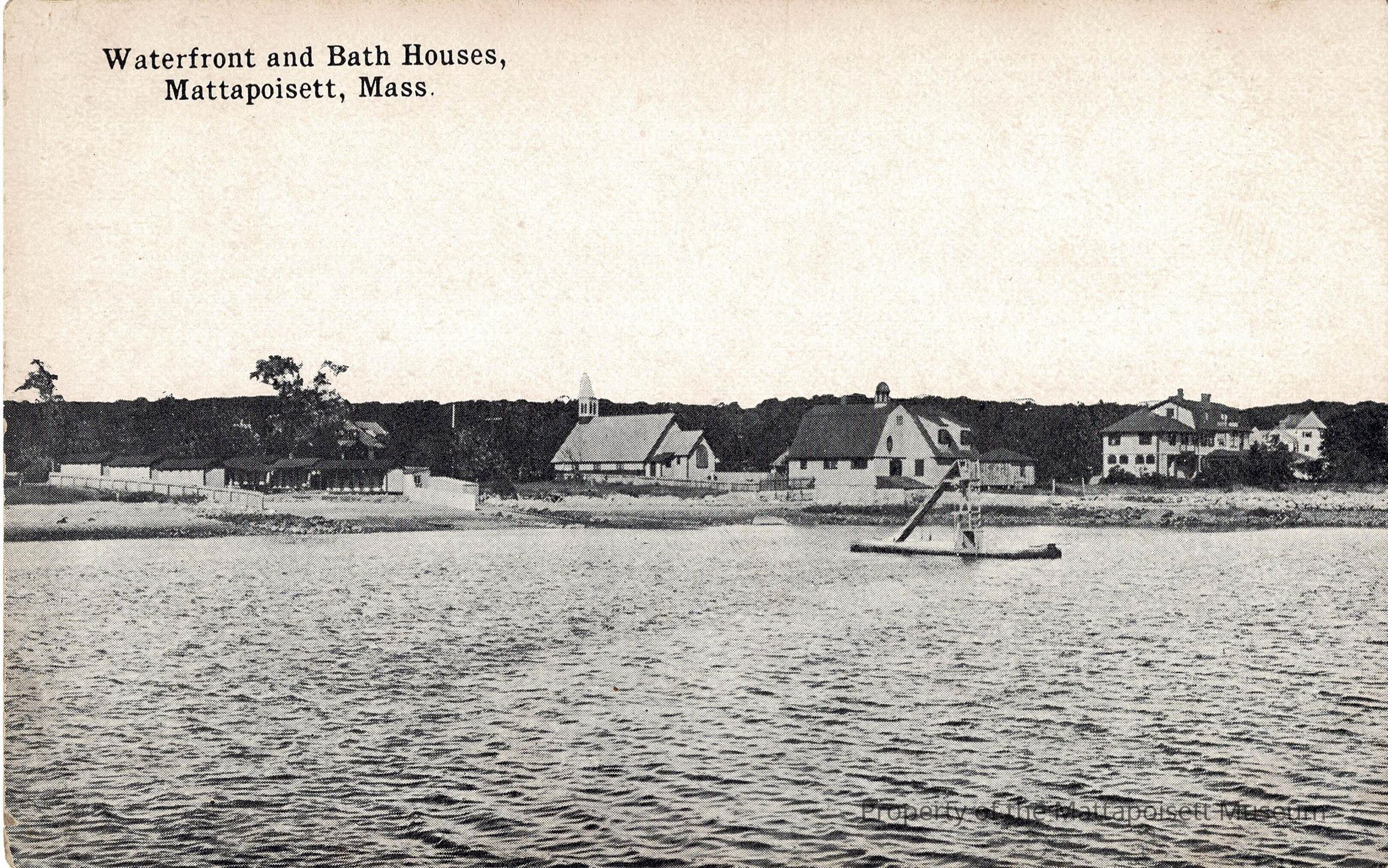 Black and white postcard showing Waterfront and Bath Houses, Mattapoisett, Mass.Collection