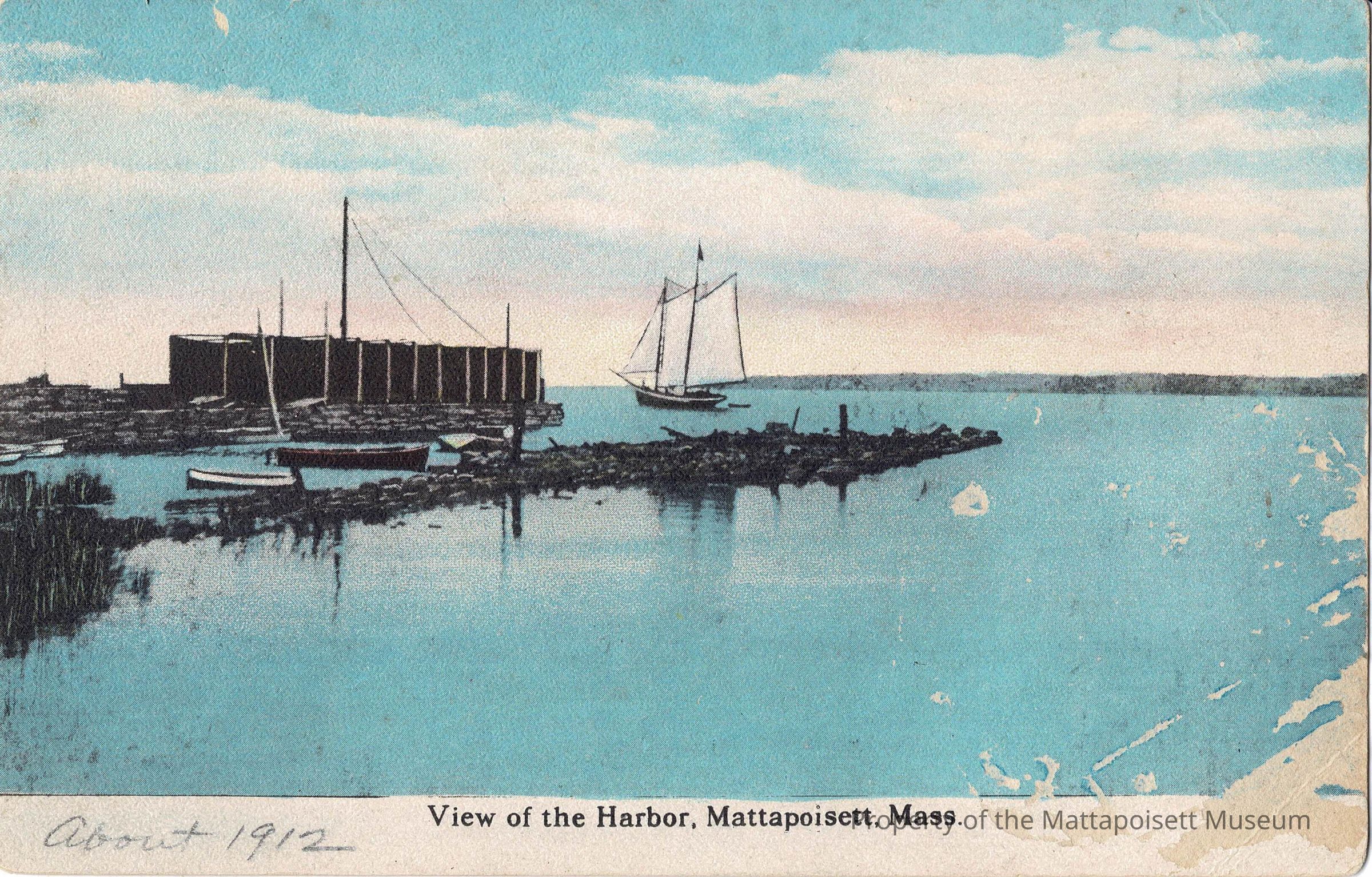 Hand-colored postcard showing View of the Harbor, Mattapoisett, Mass. Handwritten date "about 1912".Collection