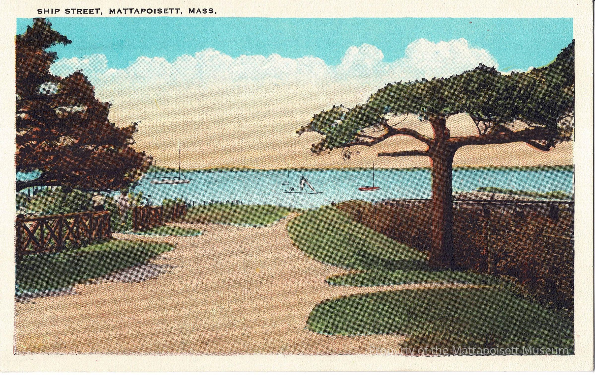 Black and white postcard with blue wash sky showing Wharf Scene, Mattapoisett, Mass.Collection