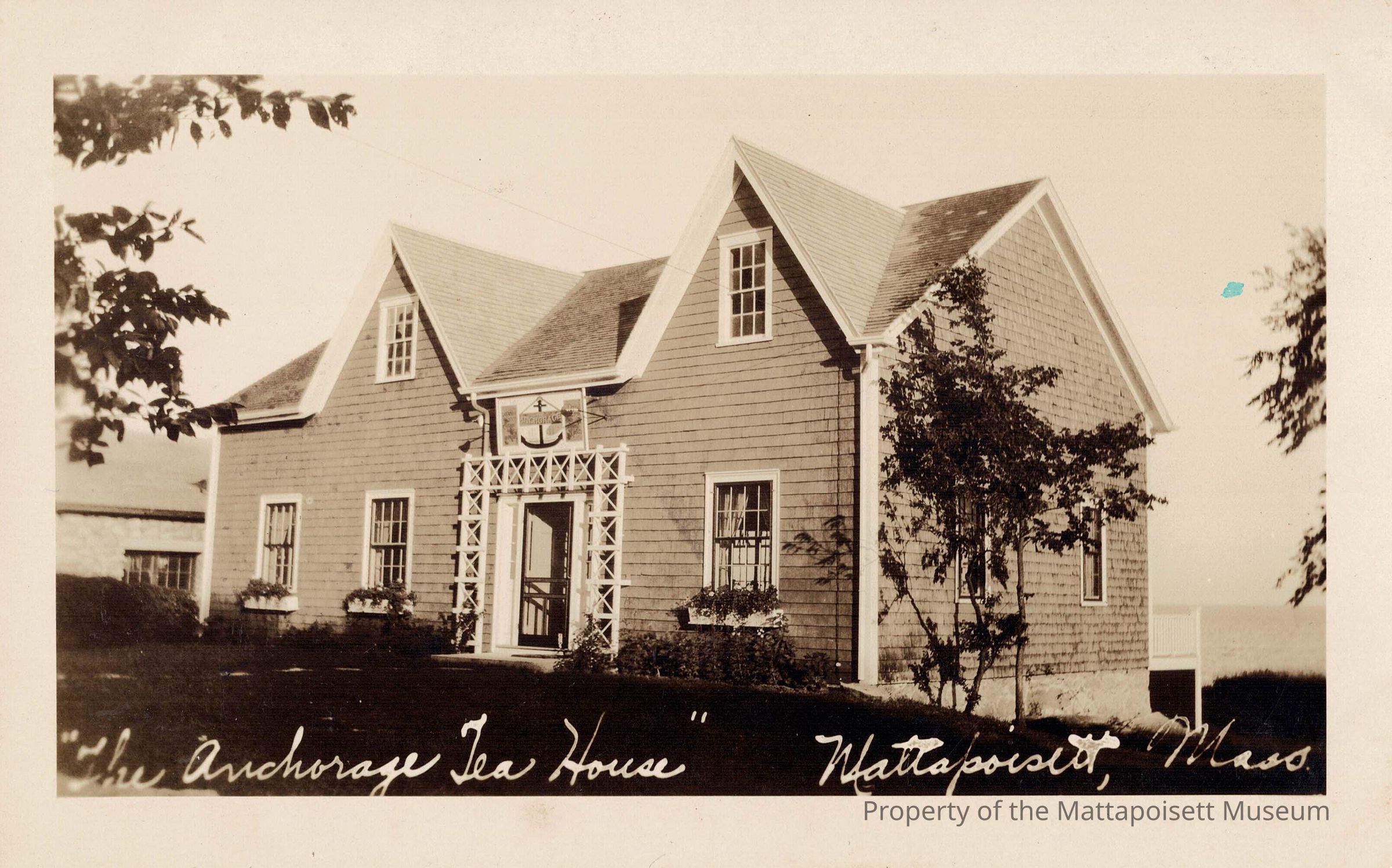 Black and white postcard showing The Anchorage Tea House, Mattapoisett, Mass.Collection