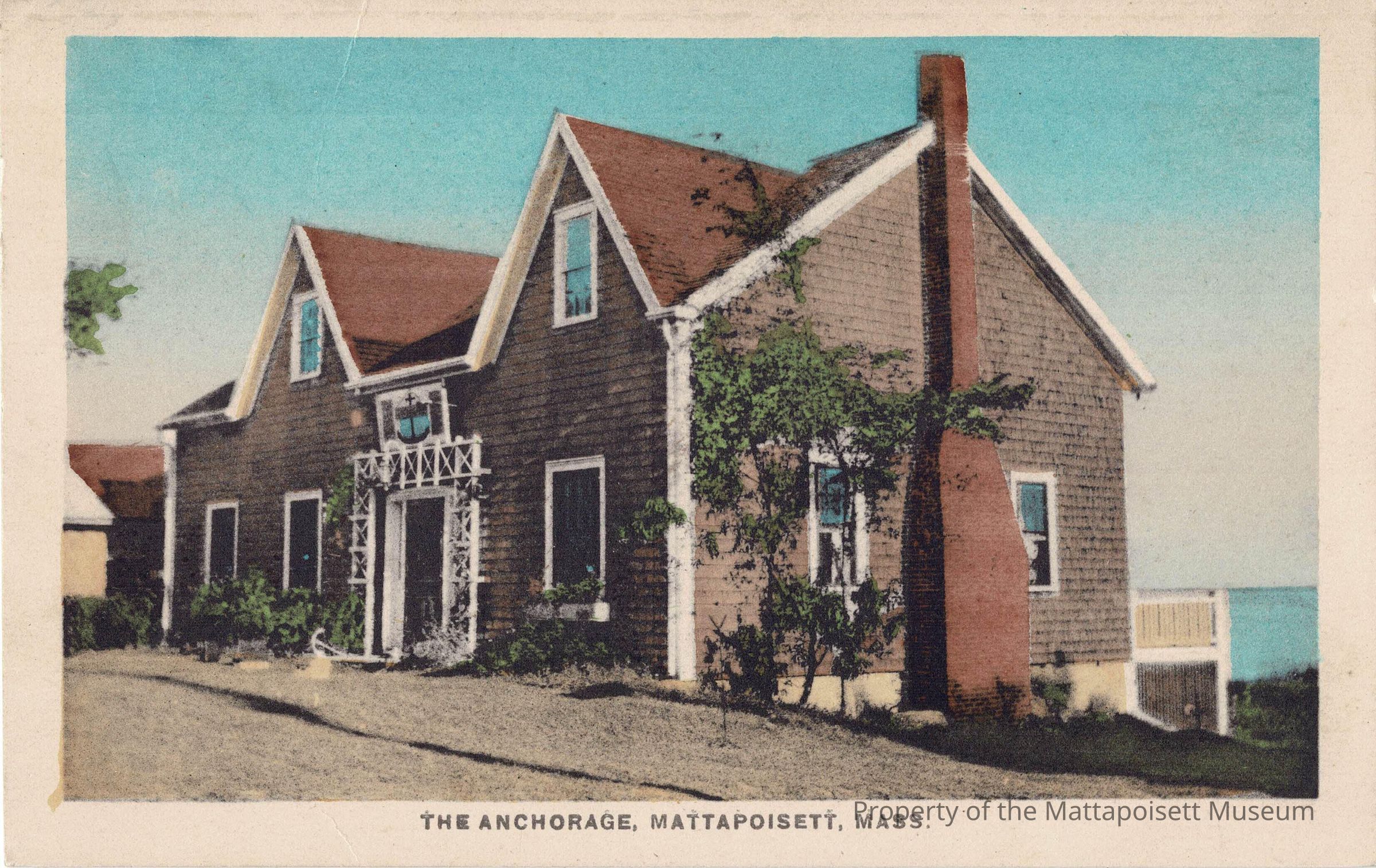 Hand-colored postcard showing The Anchorage, Mattapoisett, Mass. Hand-written note from Marion W. to Mrs. George Tinkham, Brewster, Mass. Postmarked Apr 1, 1940 from Boston, Mass.Collection