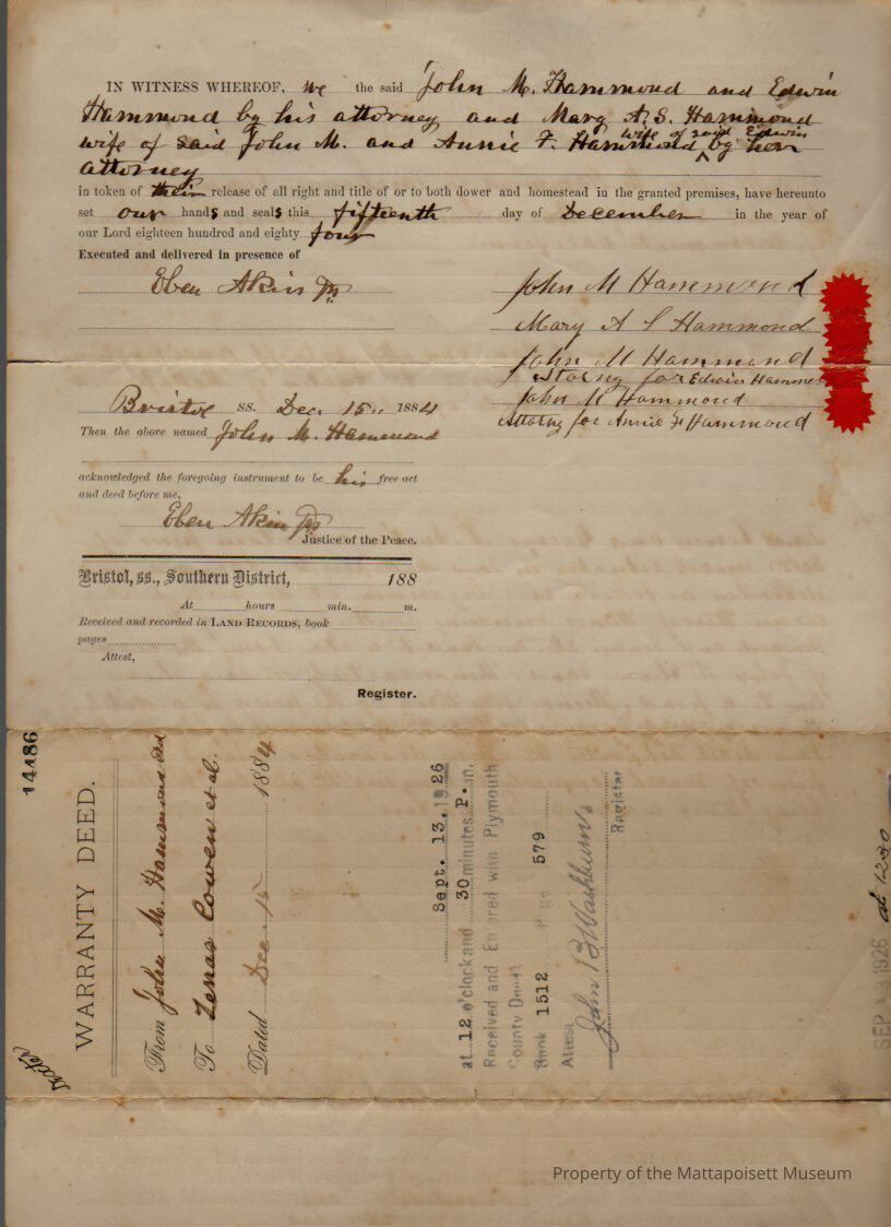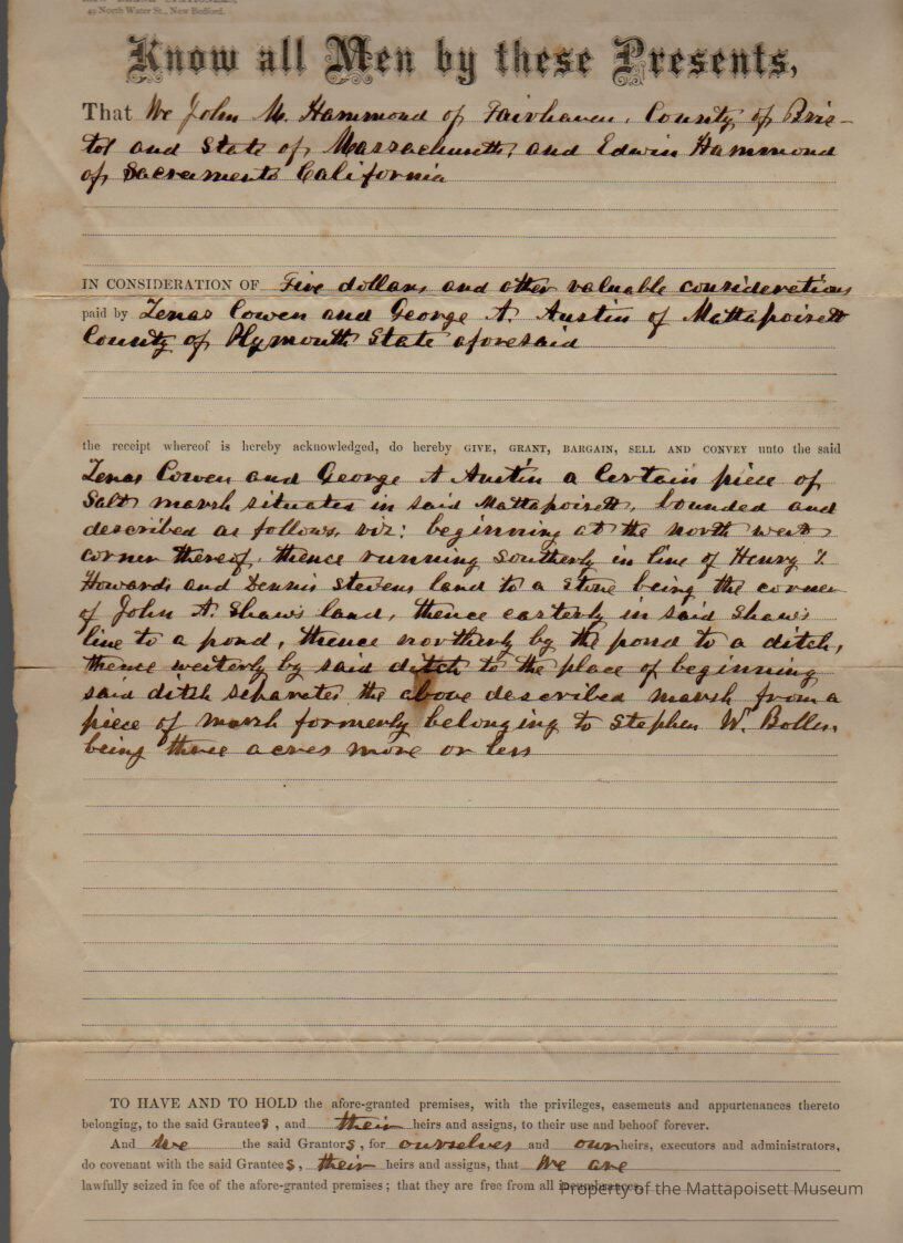 John M. & Mary A. S. Hammond & Edwin Hammond of Sacremento and Annie F. Hammond (by Attorney John M. Hammond) to George A. Austin & Zenos Cowen, 3 acres of salt marsh for $5 and other valuable considerations.Collection