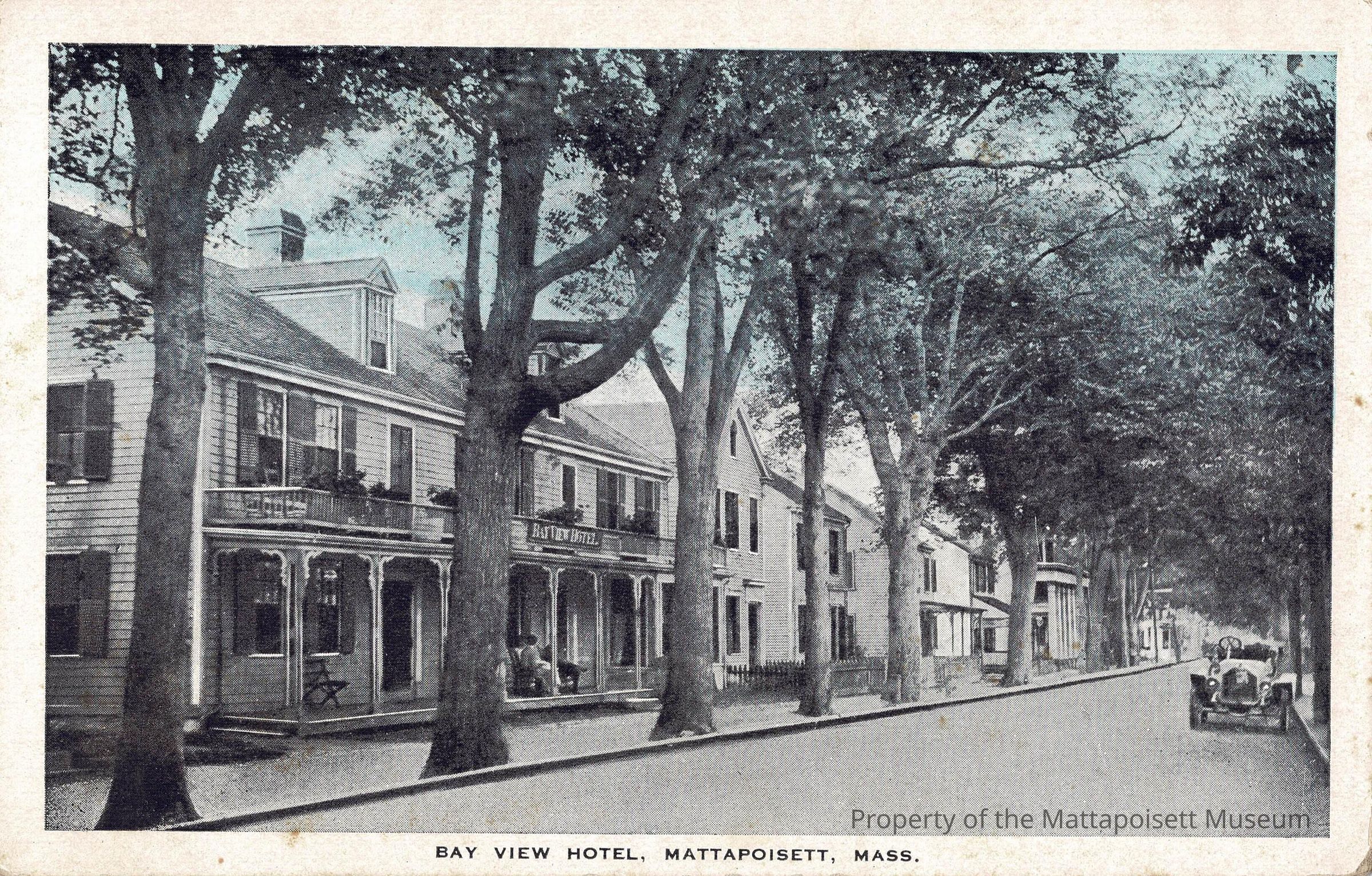 Black and white postcard with blue wash sky showing Bay View Hotel, Mattapoisett, Mass.Collection