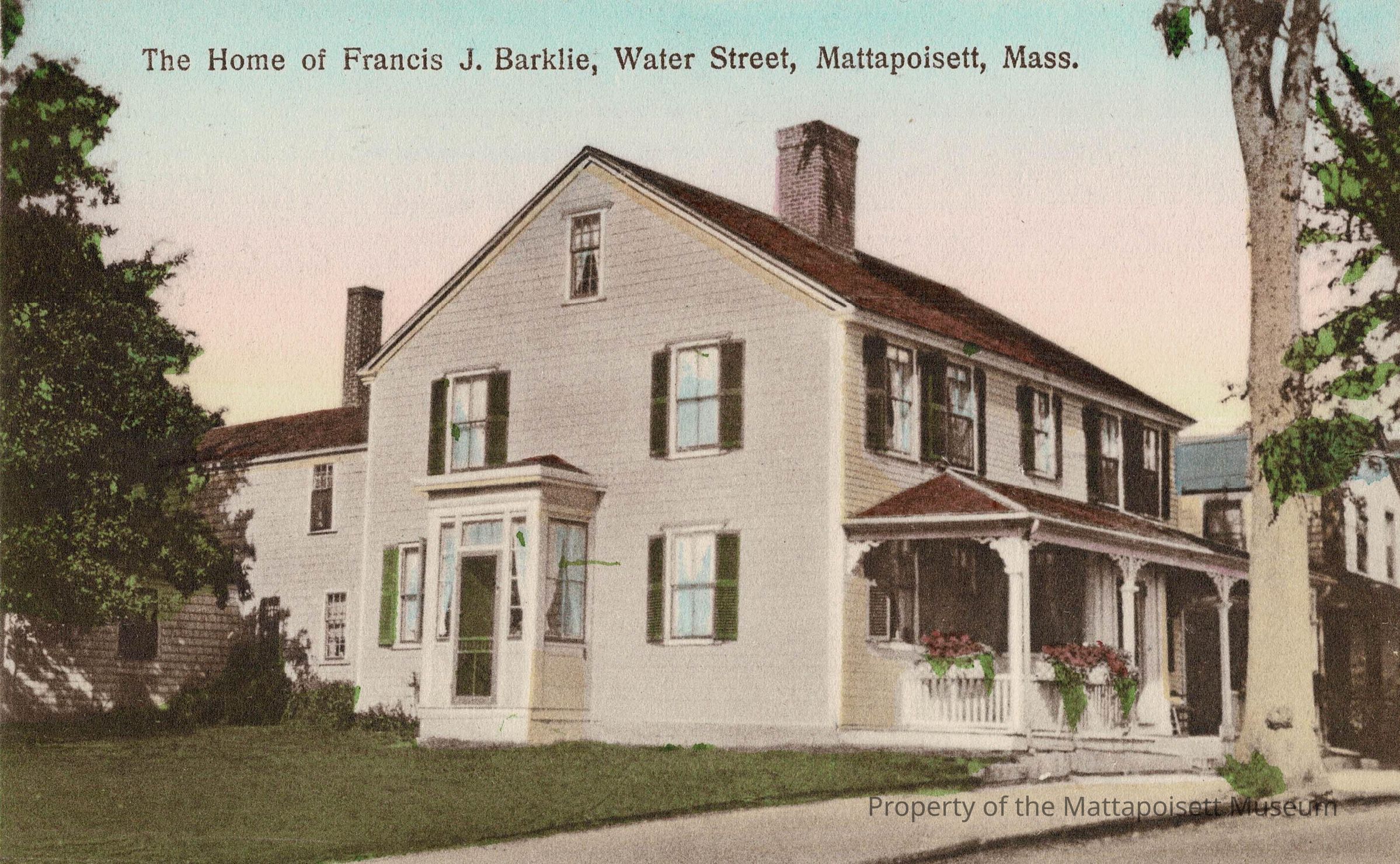 Hand-colored postcard showing The Home of Francis J. Barklie, Water Street, Mattapoisett, Mass. Handwritten notation attached to reverse stated "Formerly the Wilson Barstow house on Water St next to corner of Pearl St"Collection