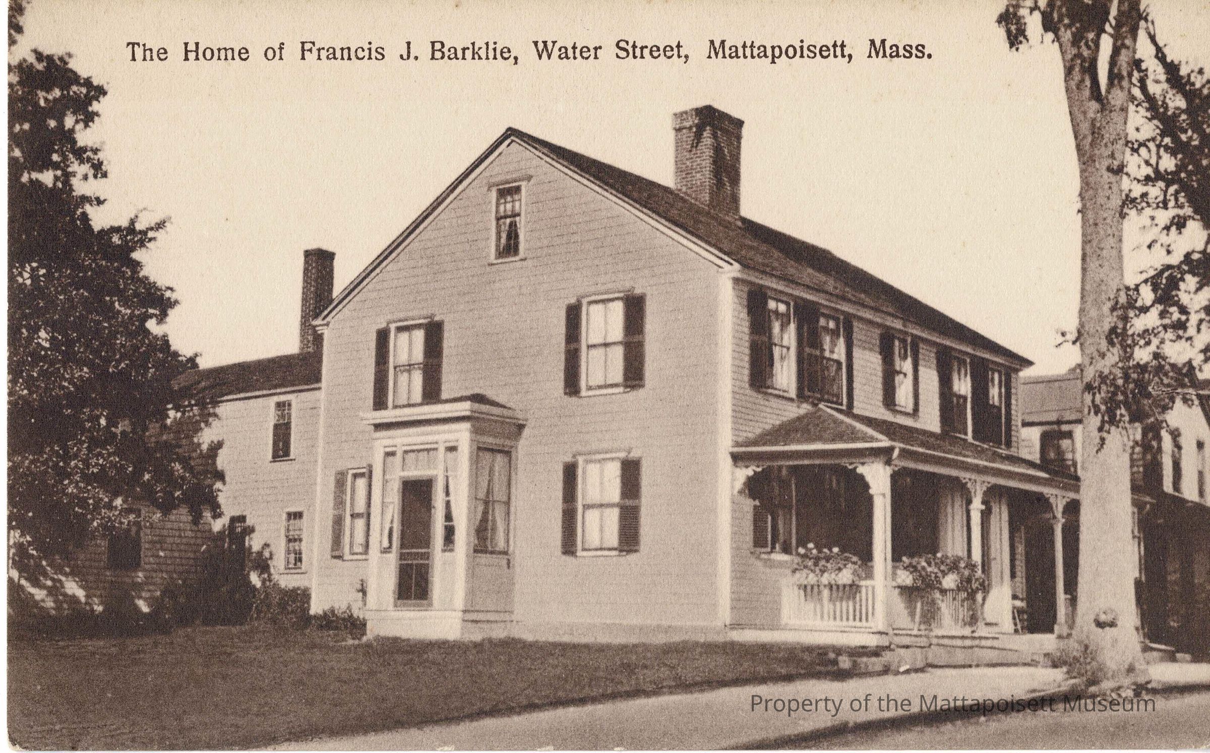 Black and white postcard showing The Home of Francis J. Barklie, Water Street, Mattapoisett, Mass.Collection