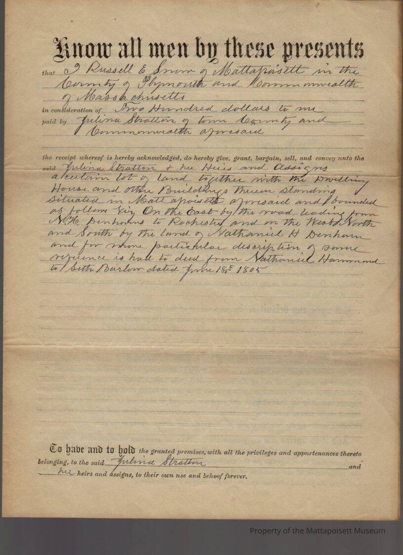 Russel E. Snow to Julina Stratton, land with dwelling house and buildings for $500.Collection