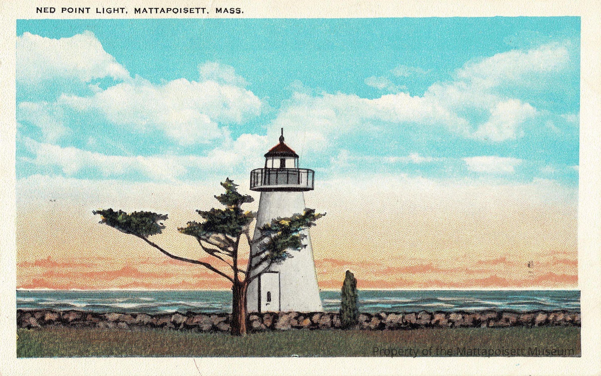 Hand-colored postcard showing Ned Point Light, Mattapoisett, Mass. Hand-written note on reverse states "wall shown has been removed".Collection