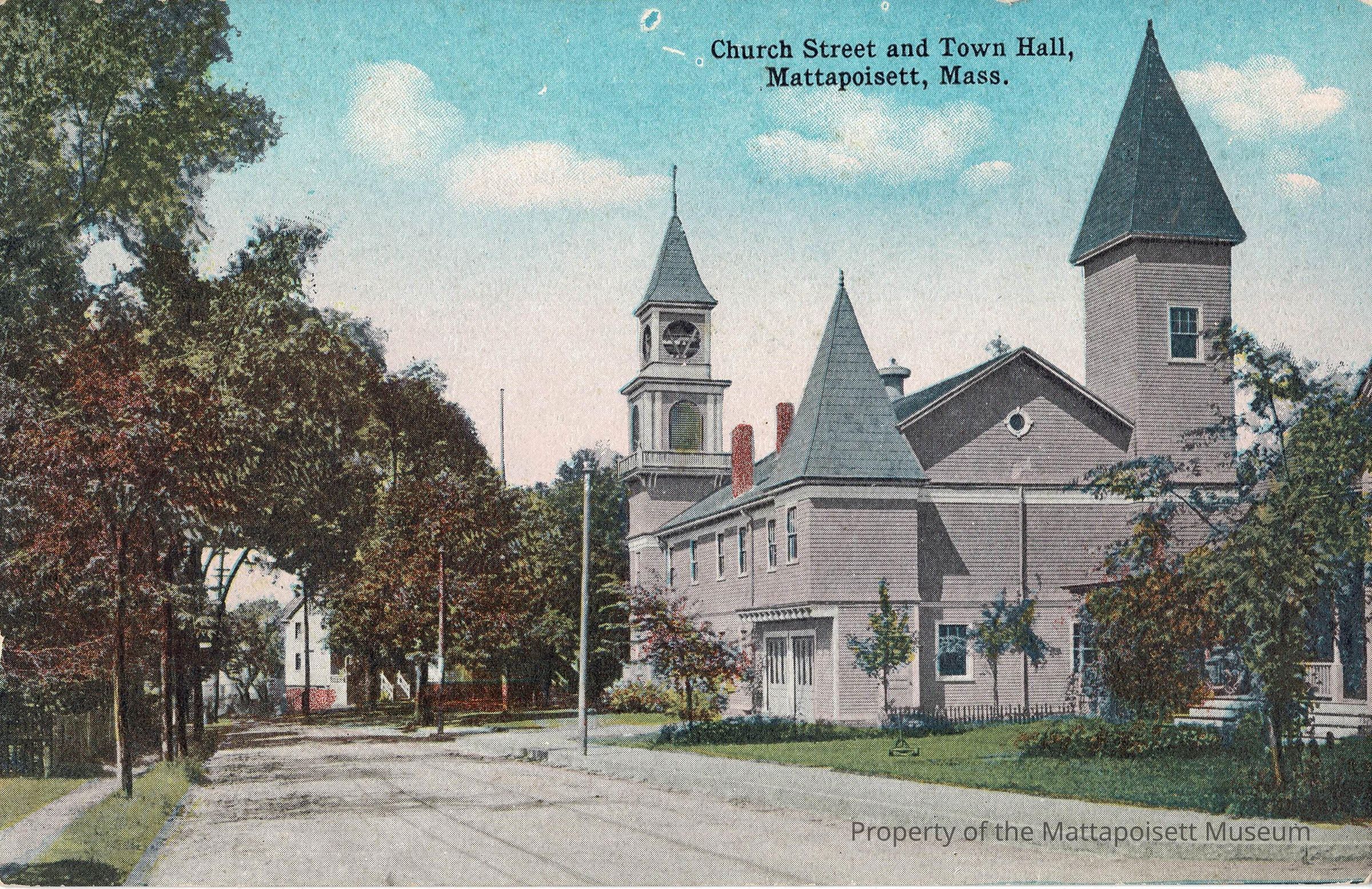 Hand-colored postcard showing Church Street and Town Hall, Mattapoisett, Mass.Collection