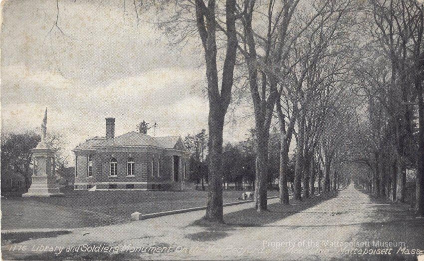 Black and white postcard showing The Library and Soldier's Monument on the New Bedford and Onset Line, Mattapoisett, Mass. Pre-addressed Alice C. Ordway, North Street, Mattapoisett, Mass.Collection