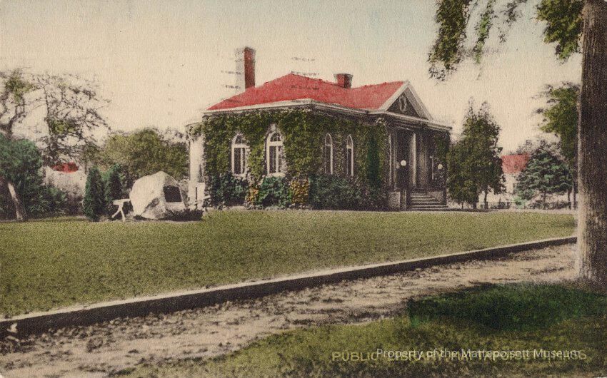 Hand-colored postcard showing Public Library, Mattapoisett, Mass. Hand-written note on reverse to Mrs. George L. Tinkham, Brewster, Mass. from Esther stating "Dear Mary, You are always welcome and we will be so glad to see you. We got your cards to-day and you must have had a wonderful trip. You can tell us all about it when you come. We will see you then next Saturday. Love Esther. Postmarked on Oct 16, 1950 from Providence, RI.Collection