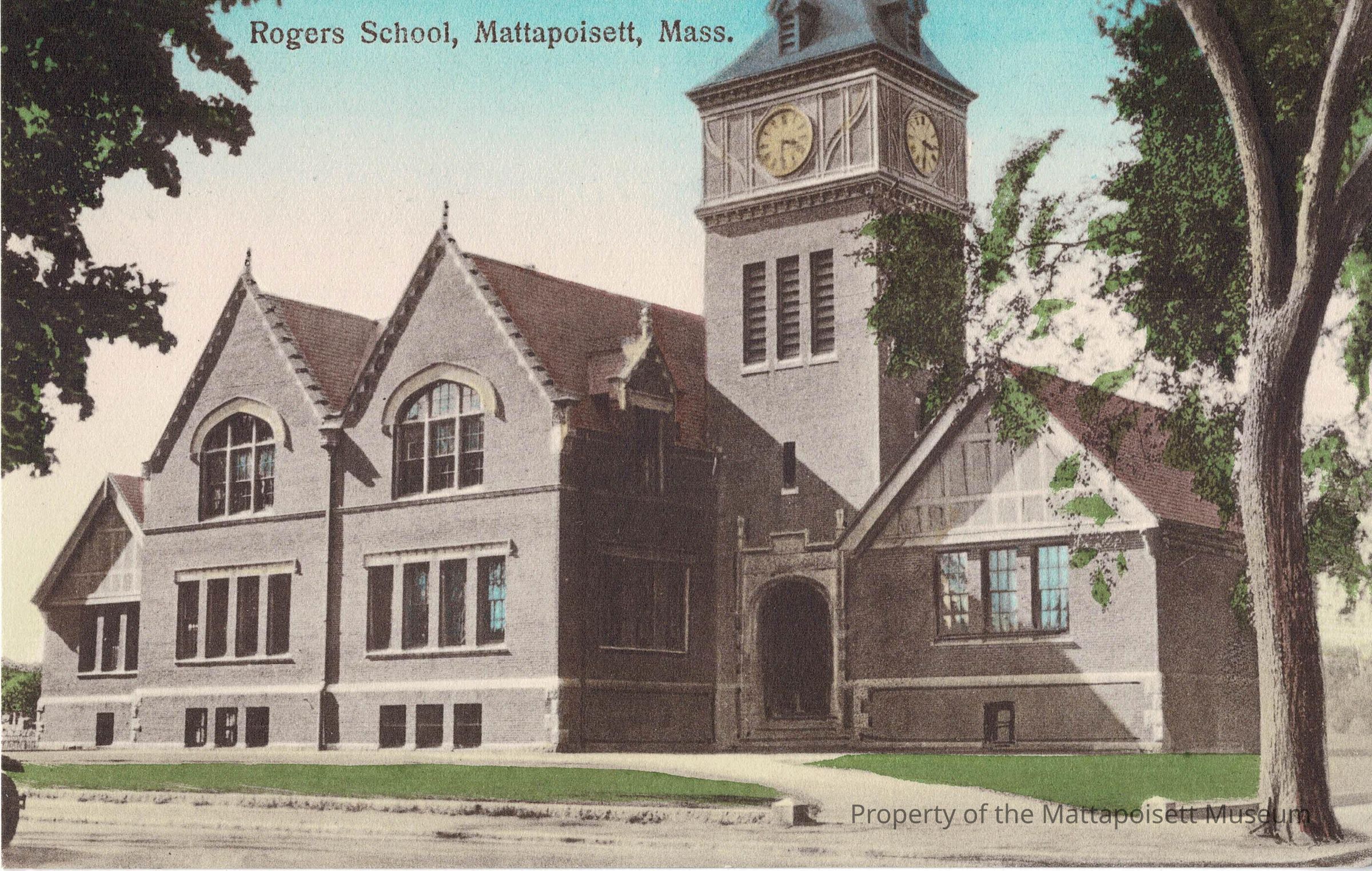 Hand-colored postcard showing Rogers School, Mattapoisett, Mass.Collection
