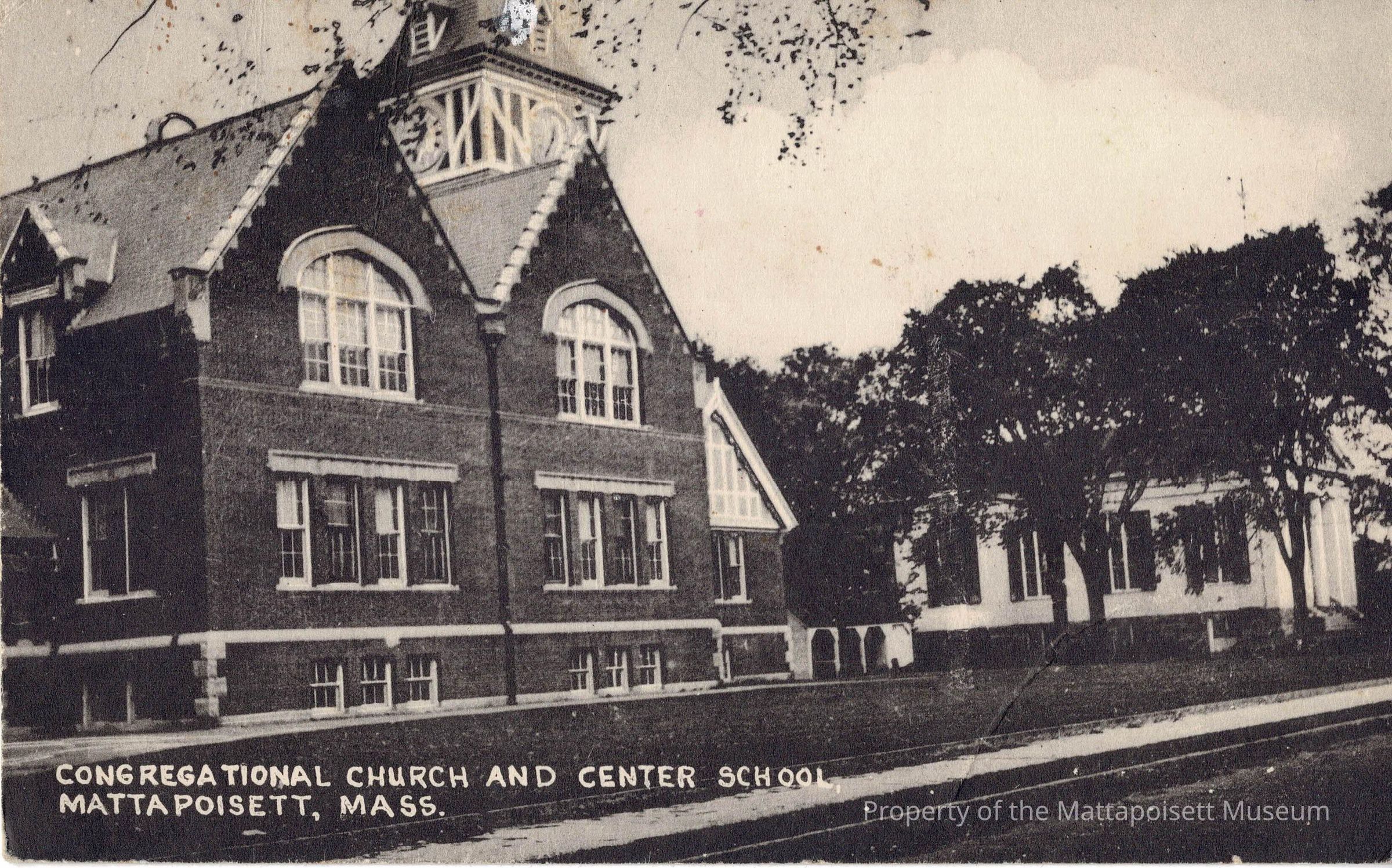 Black and white postcard showing Congregational Church and Center School, Mattapoisett, Mass. Hand-written note to Miss Sue E. Erhard, Camp Wind-in-the-Pines, Route #2, Buzzards Bay, Mass. Postmarked Aug 23, 1951 from Mattapoisett, Mass.Collection