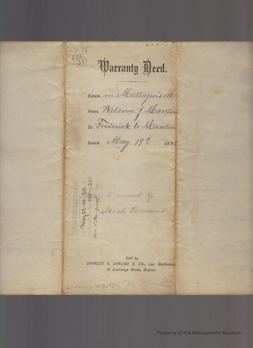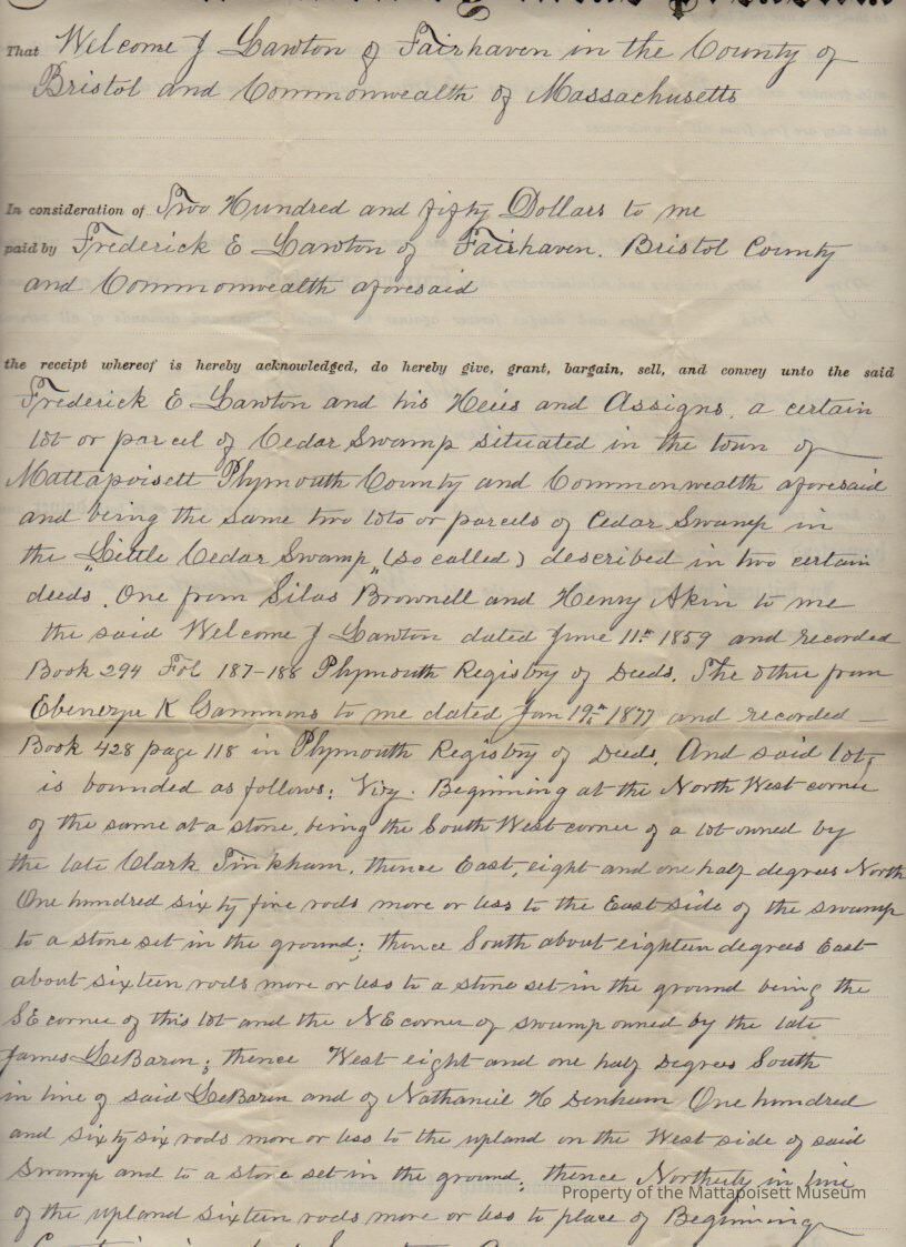 Welcome J. & Alvira B. Lawton of Fairhaven to Frederick E. Lawton to Fairhaven, cedar swamp for $250.Collection