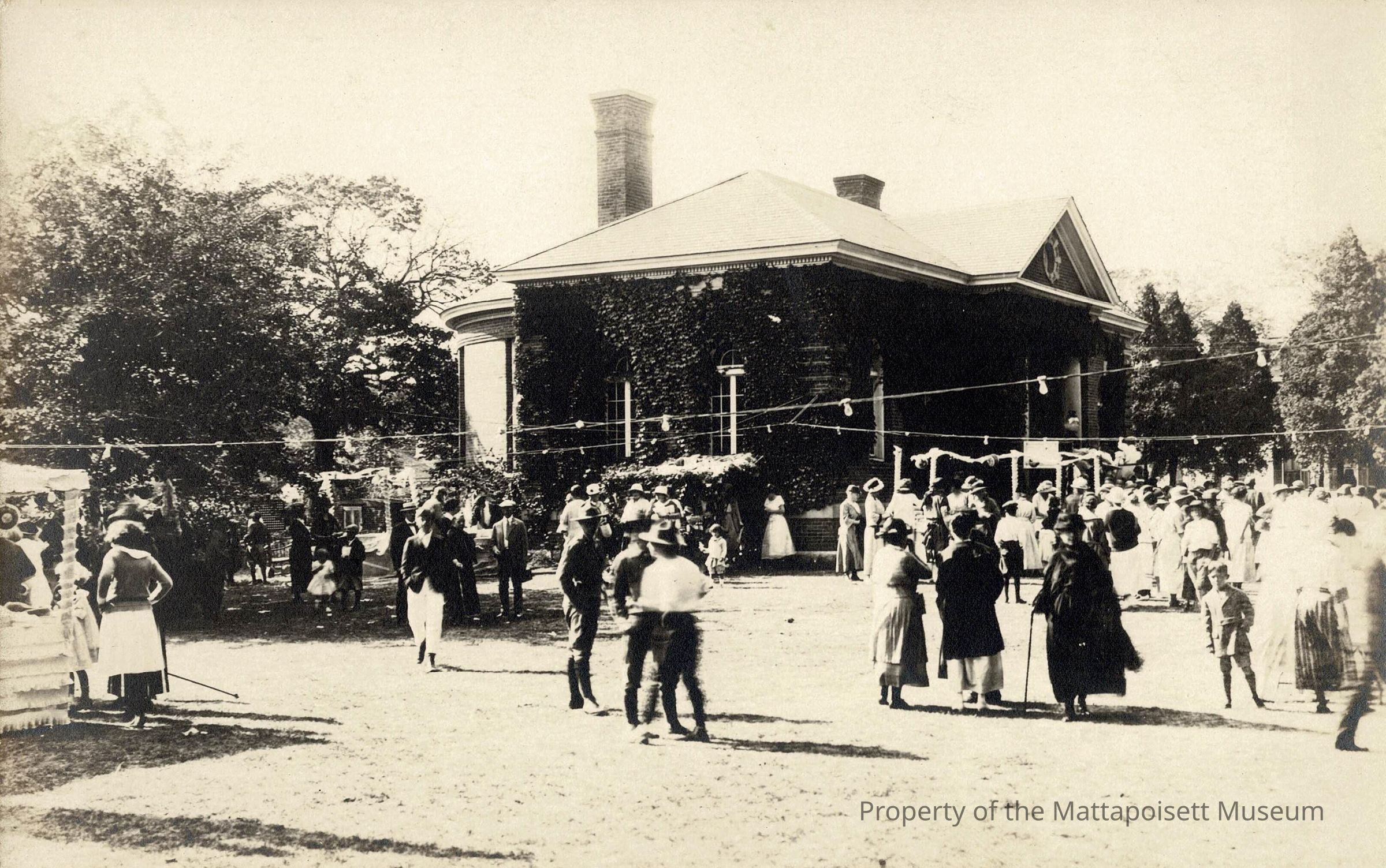 Black and white postcard showing Mattapoisett Improvement Association Fair. Hand-written on reverse states "Improvement Lawn Party".Collection