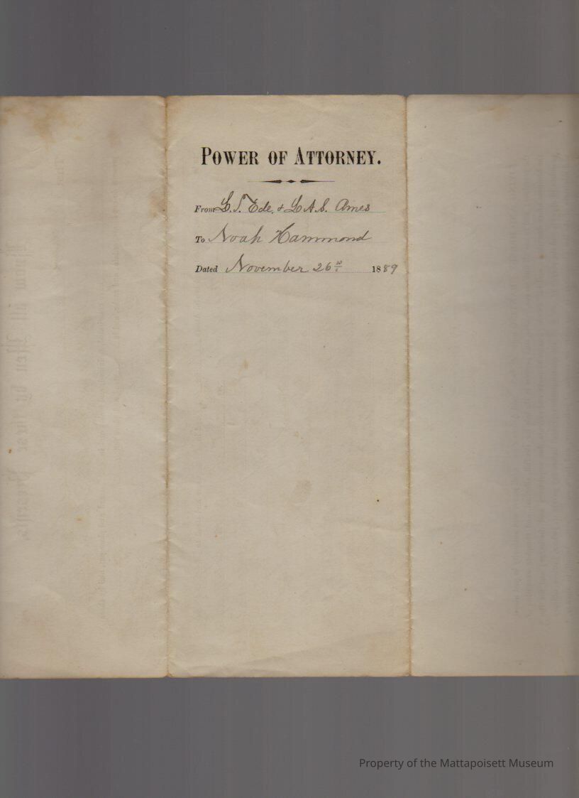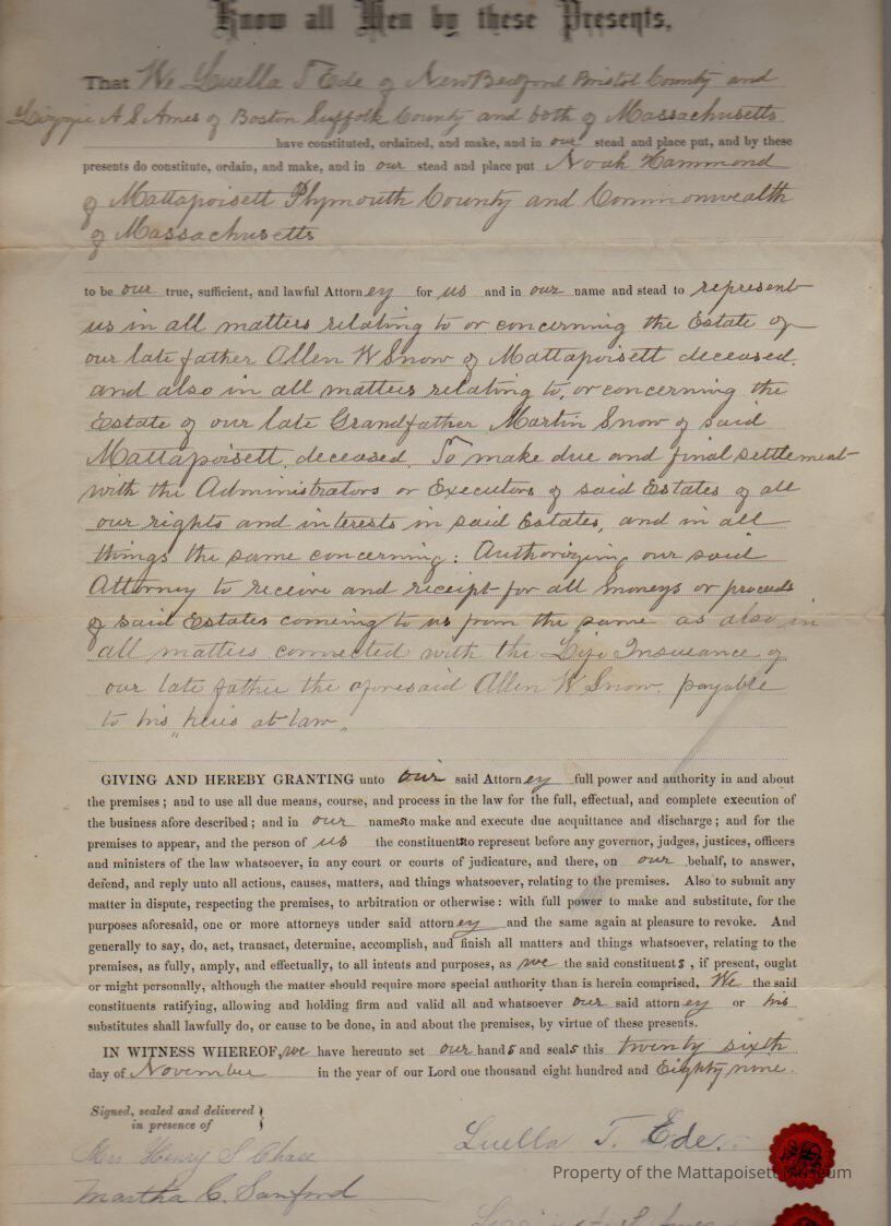 Louella T. Ede of New Bedford & Lizzie A. S. Ames of Boston, Power of Attorney to Noah Hammond, for the sale of the estate of father, Allen Winslow.Collection